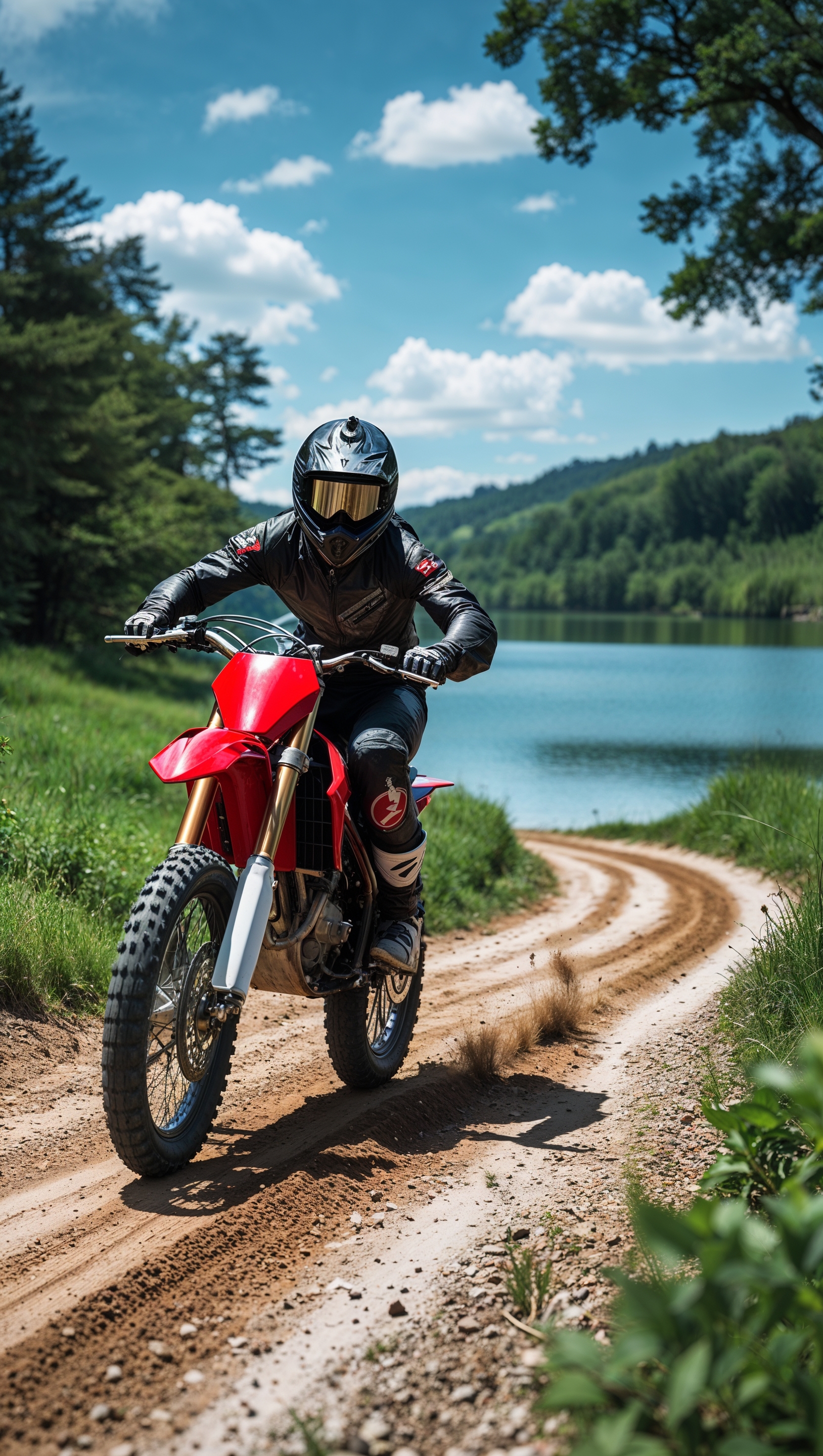 1664x2944 A dirt bike riding on a dirt path next to a lake, for an iPhone wallpaper