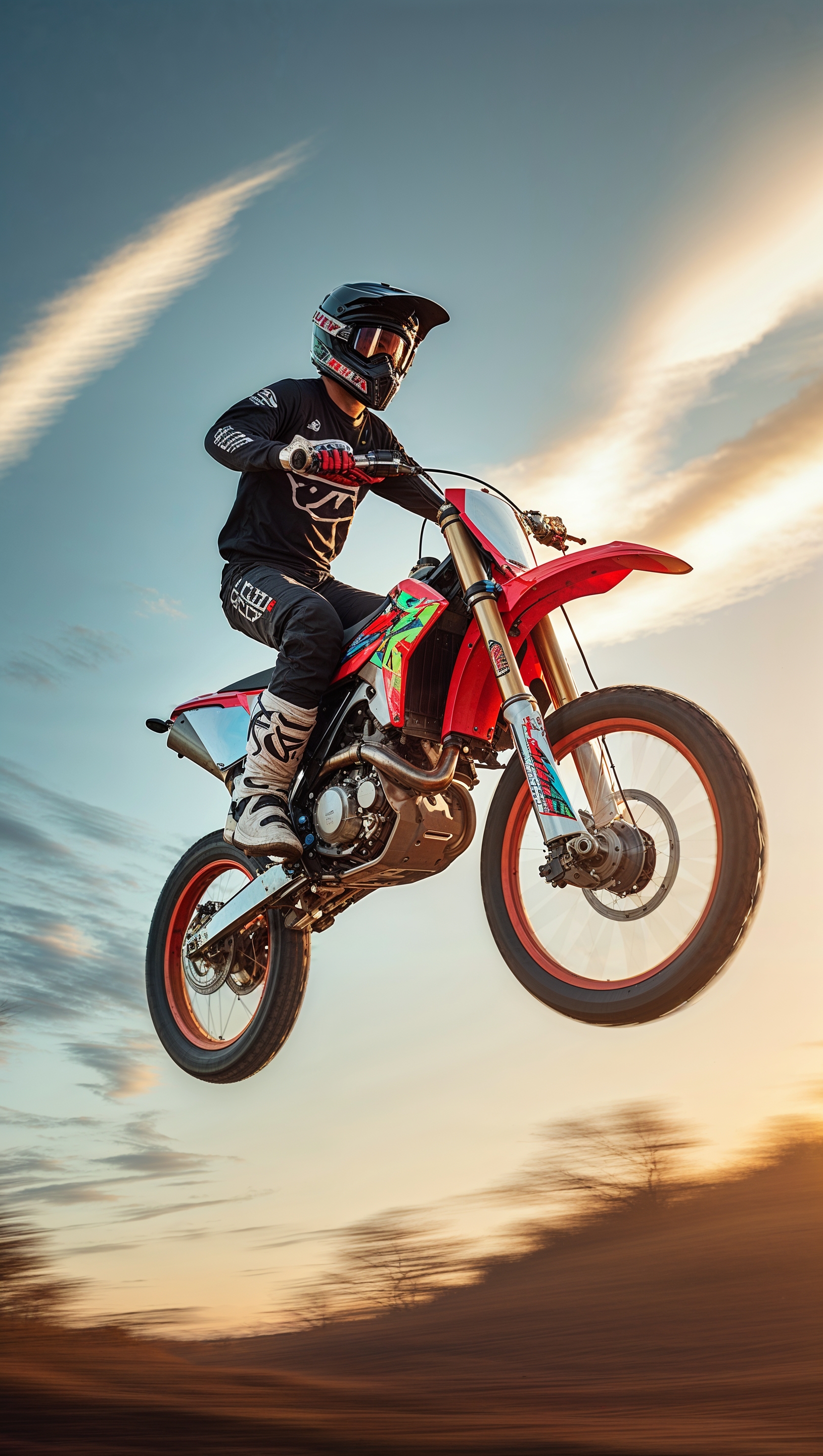 1664x2944 A dirt bike jumping in the open with morning light, for an iPhone wallpaper