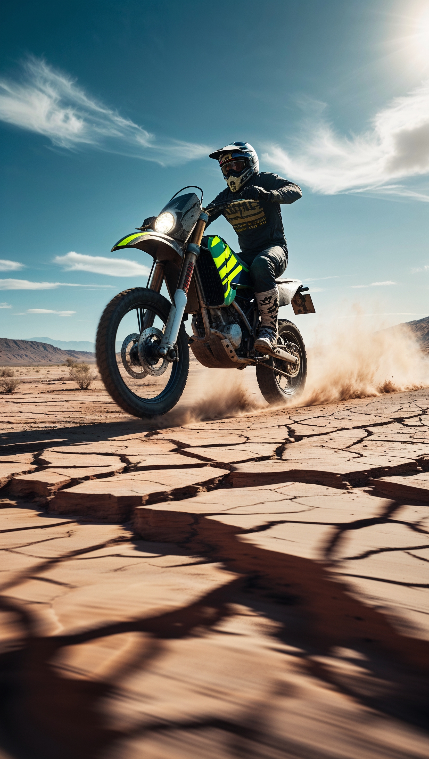 1664x2944 An image of a dirt bike riding on dry cracked earth, for an iPhone wallpaper