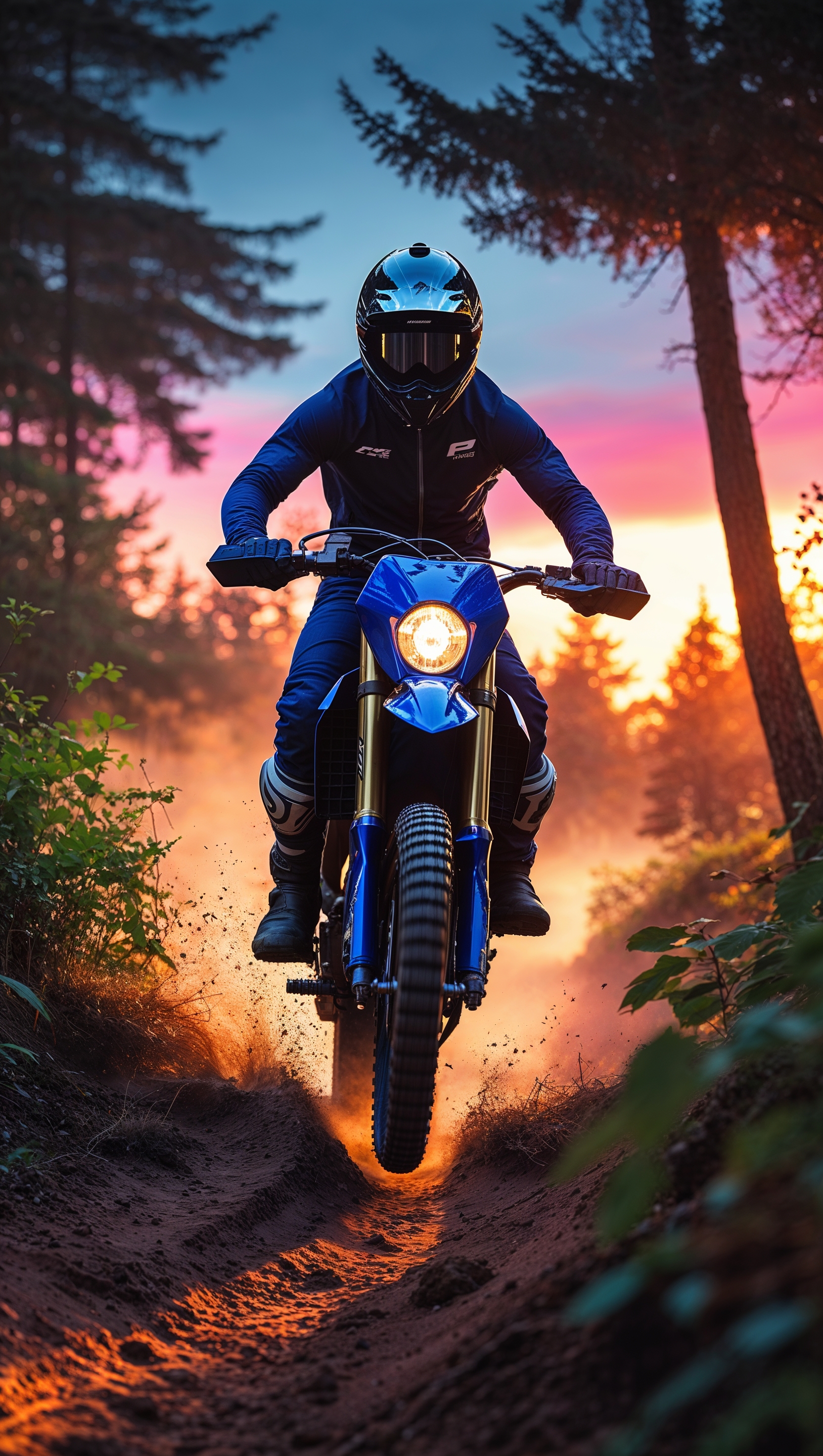 1664x2944 A dirt bike riding through forest trails at sunset, for an iPhone wallpaper