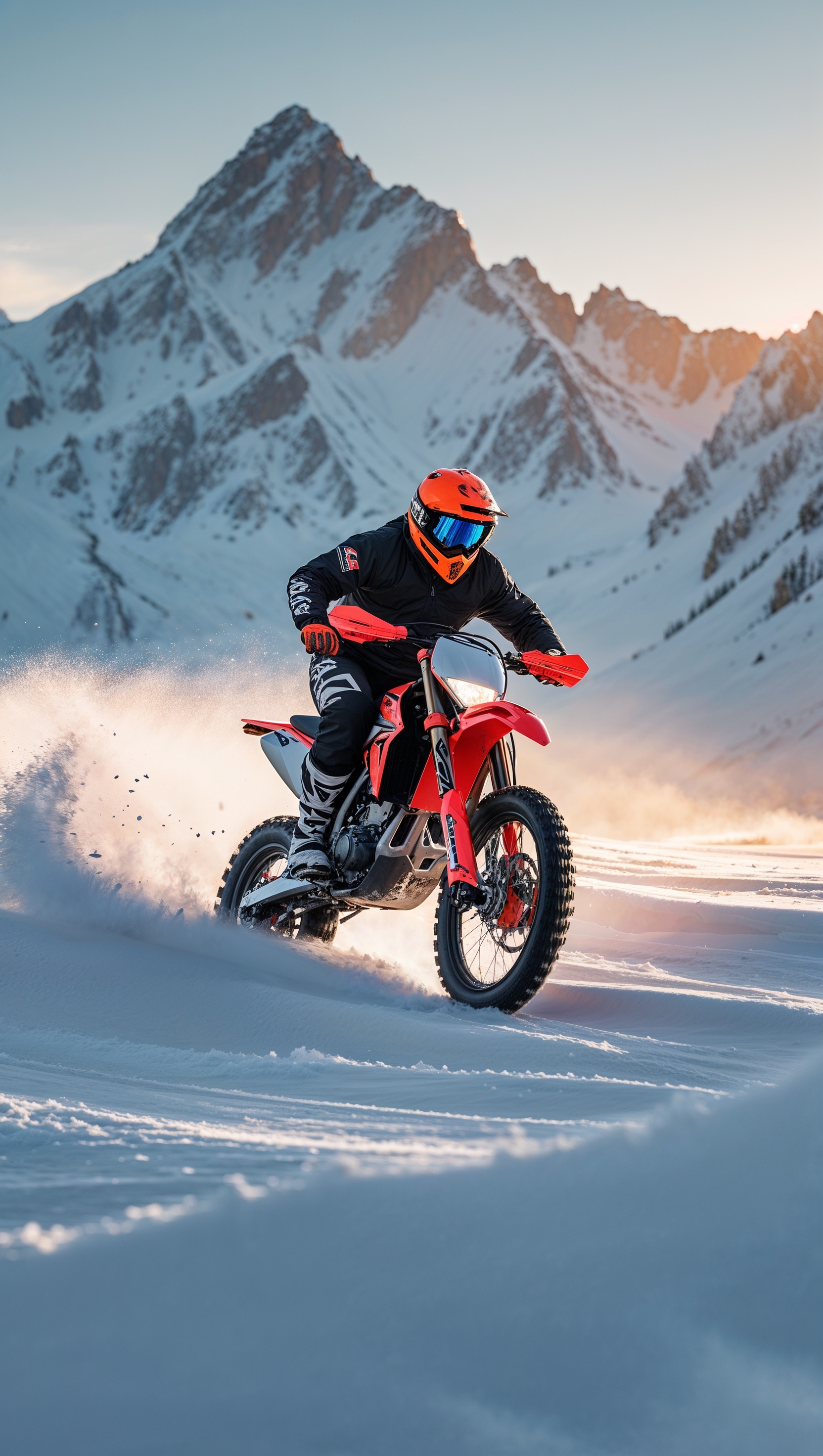 1664x2944 A dirt bike riding through snow-covered mountains, for an iPhone wallpaper
