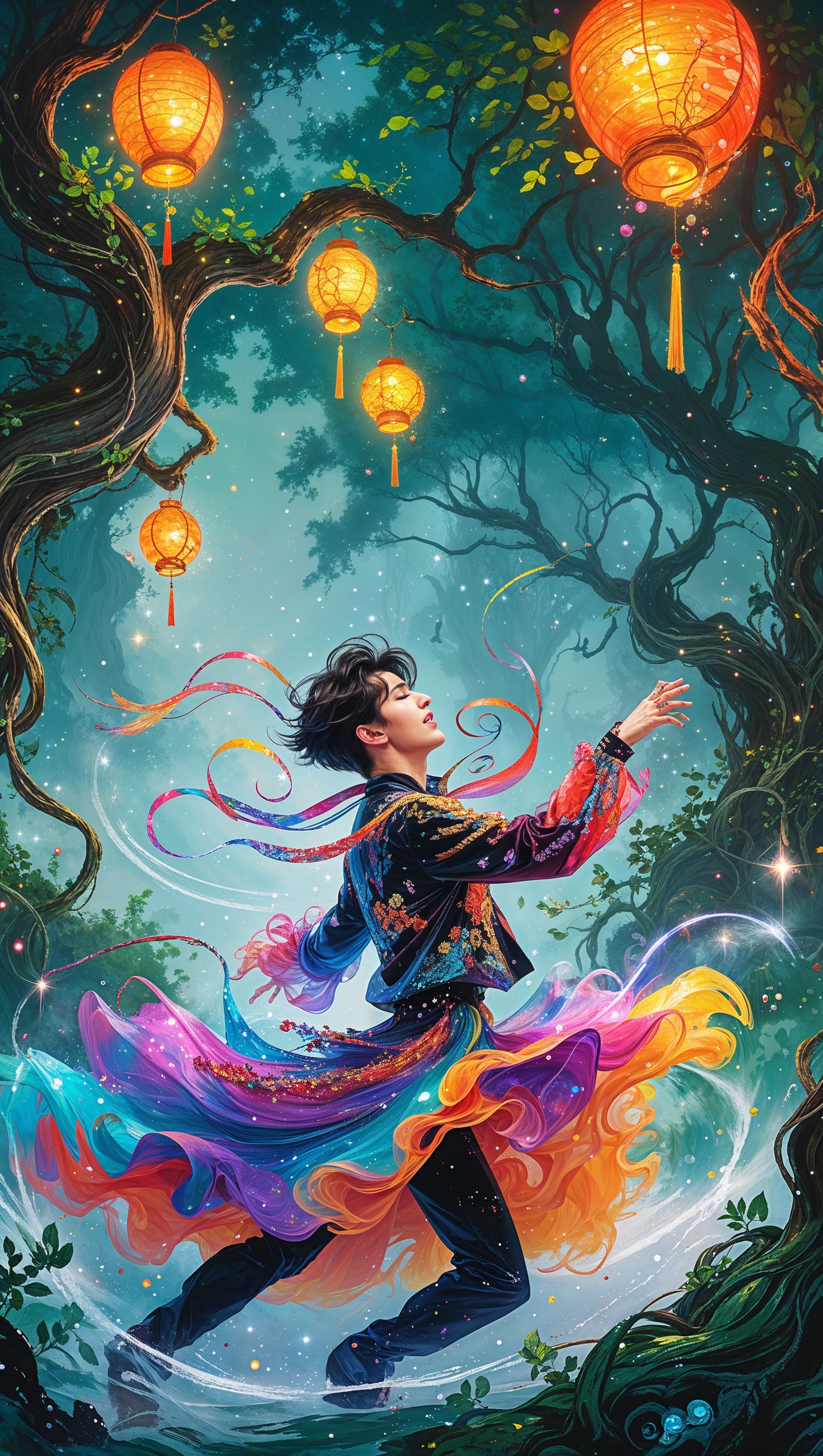 1664x2944 Design a wallpaper with Jungkook in a fantasy space with strange trees