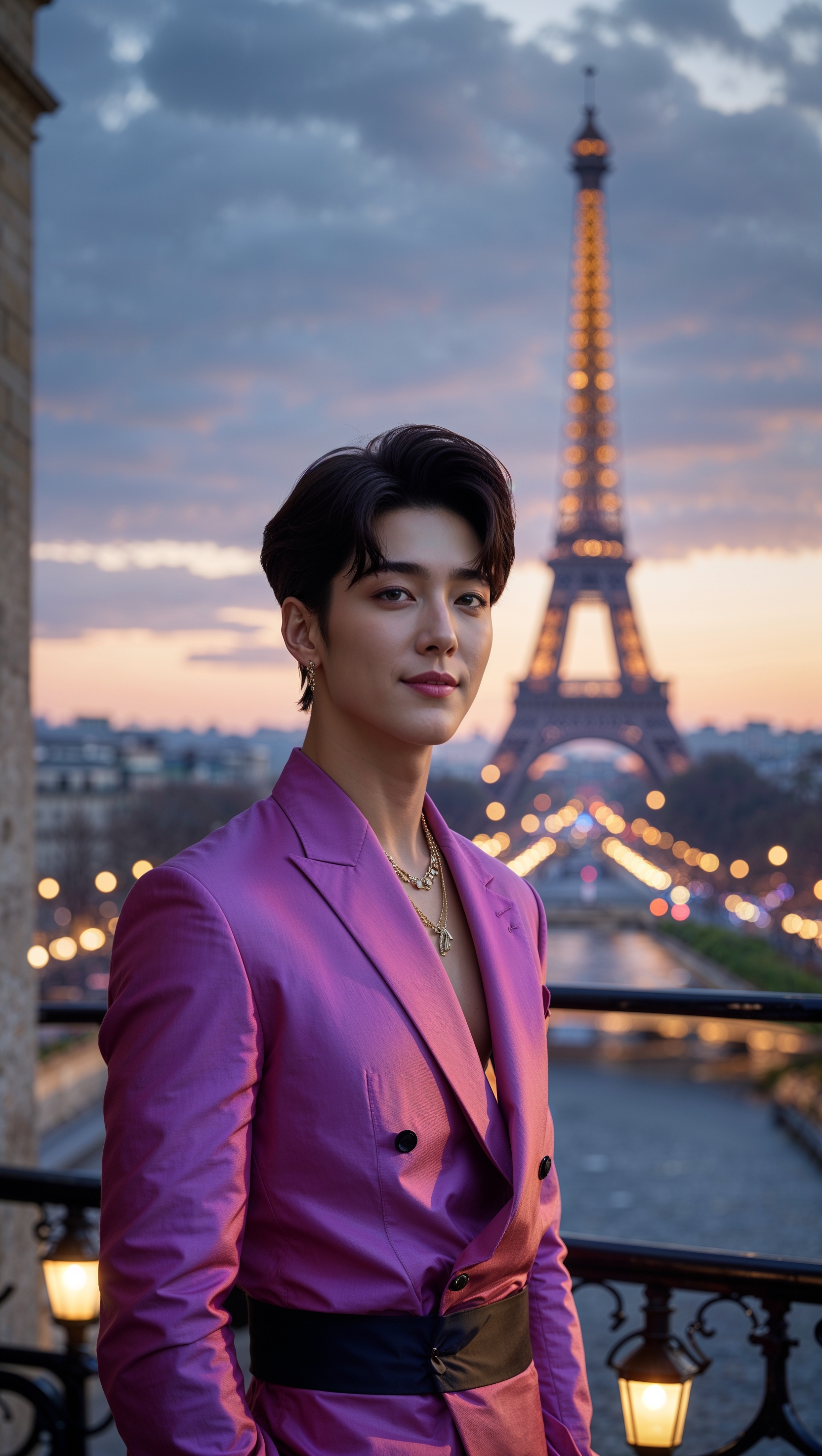 1664x2944 An image of Jungkook in a Parisian setting with the Eiffel Tower in the background