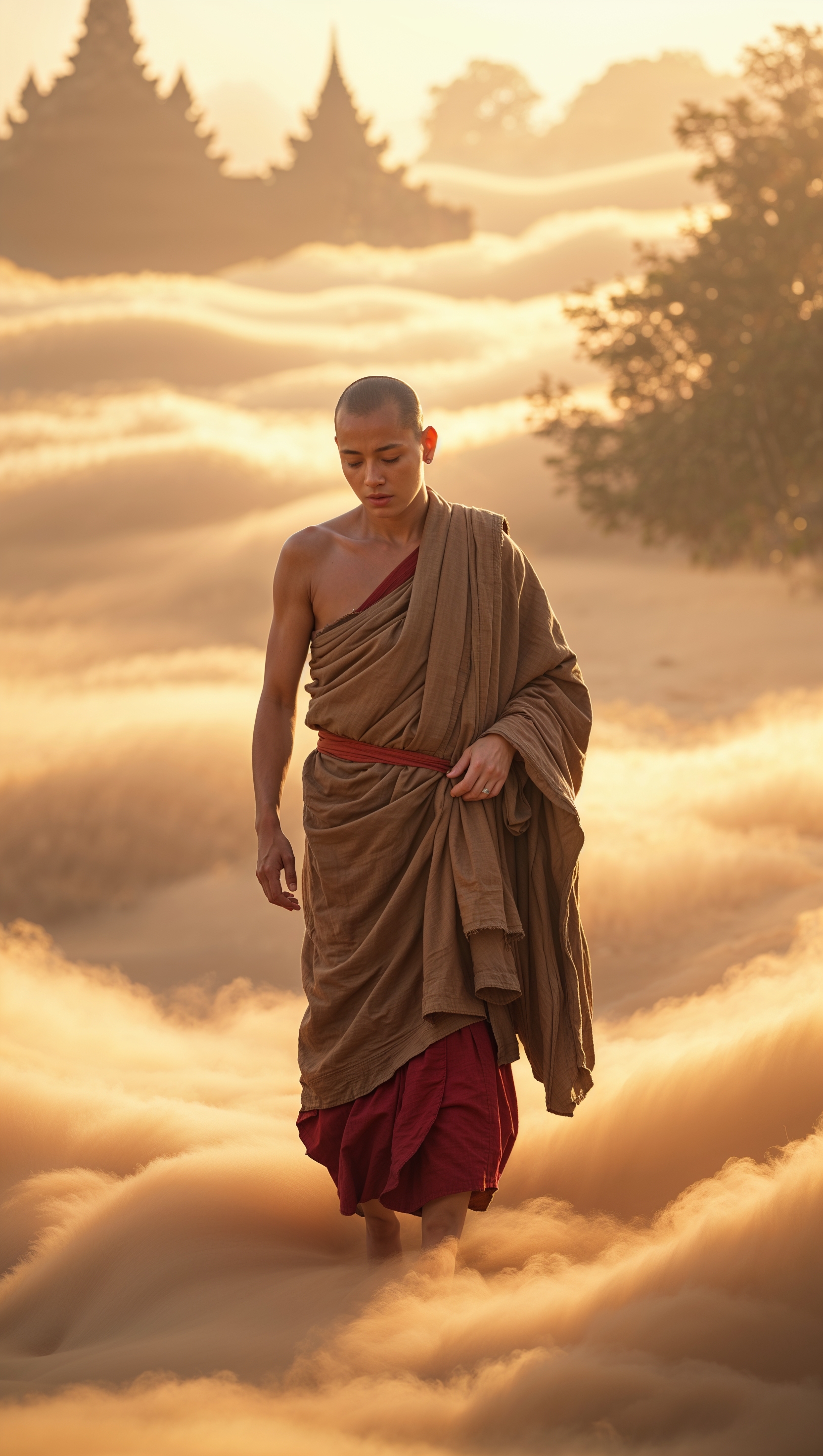 1664x2944 Monk walking into golden fog – metaphor for enlightenment