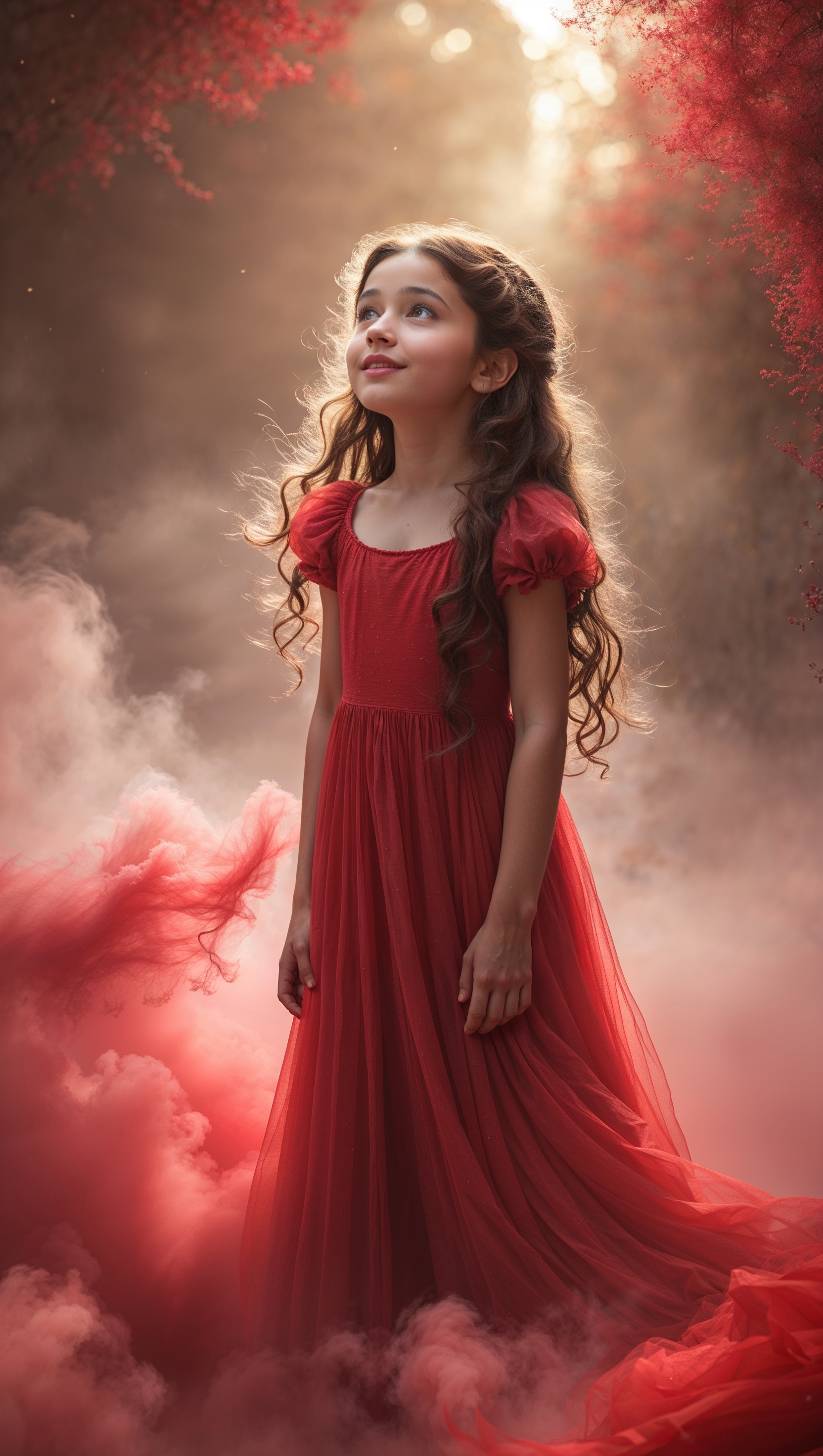 1664x2944 Girl in red dress in red mist with a dreamy atmosphere
