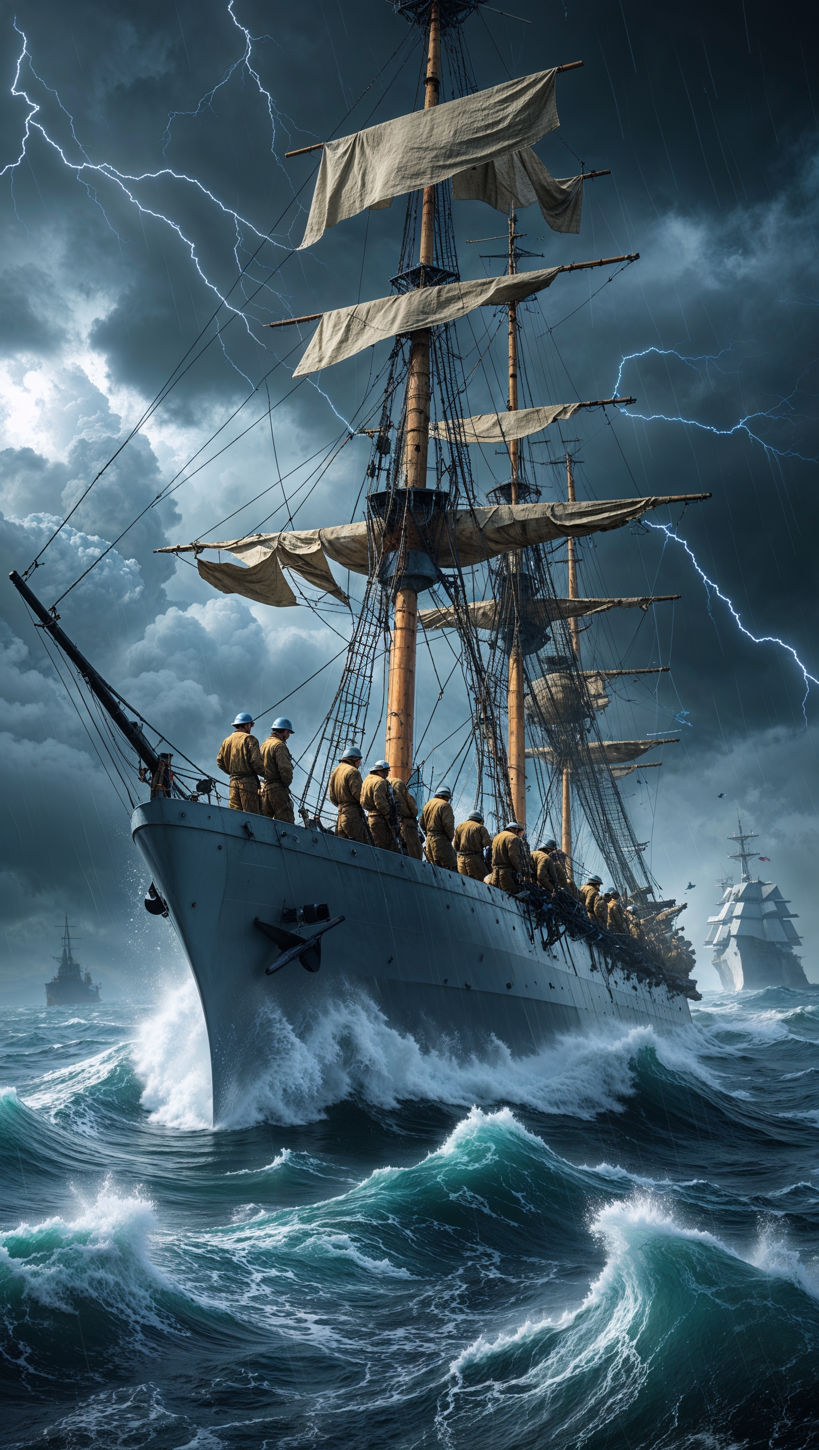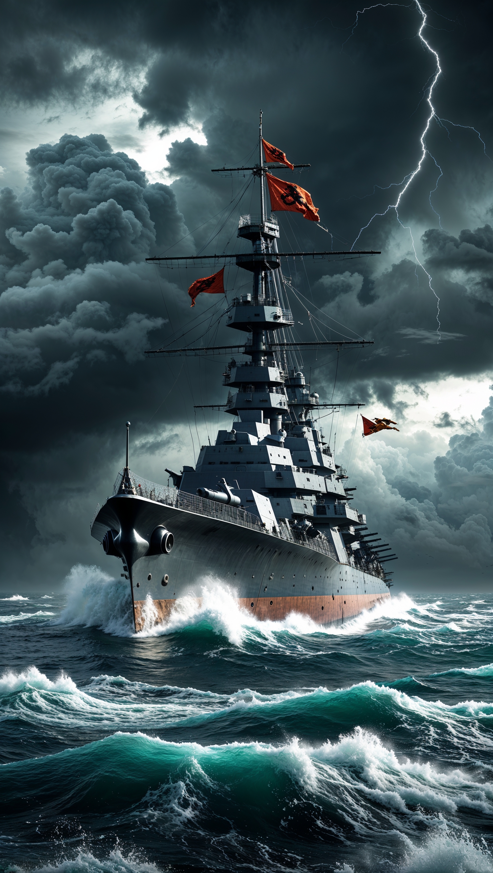 1664x2944 An image of a warship moving in the ocean with a dark and stormy sky