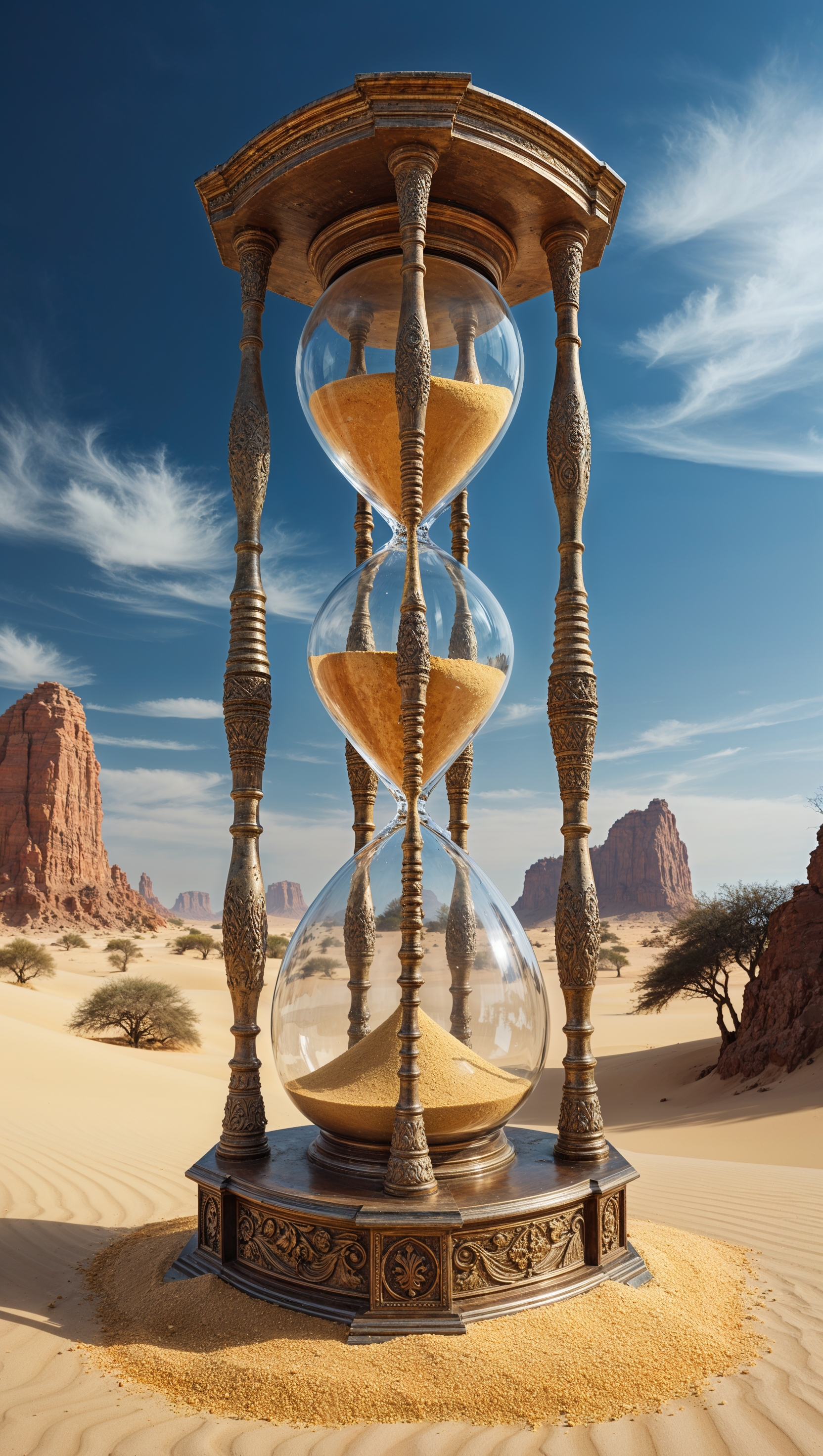 1664x2944 A giant hourglass in the desert, showing the passage of time and fate