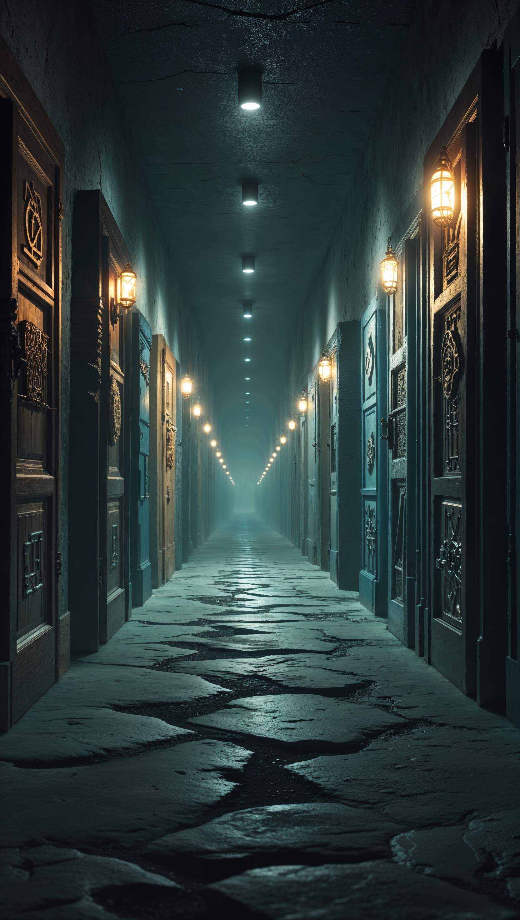 1664x2944 A hallway filled with closed doors, representing different paths of destiny