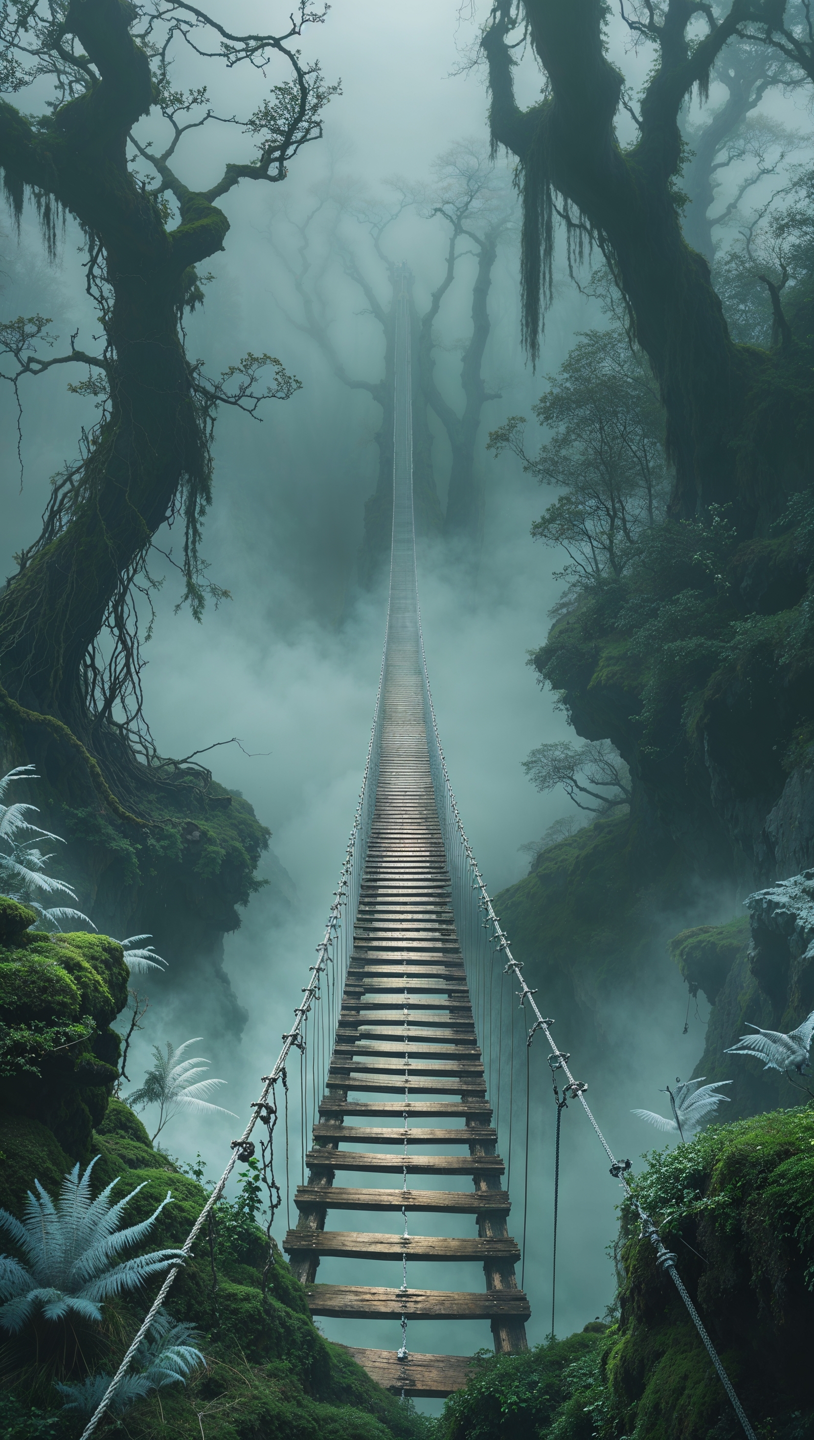 1664x2944 A hanging bridge in the mist, linking two worlds of fate