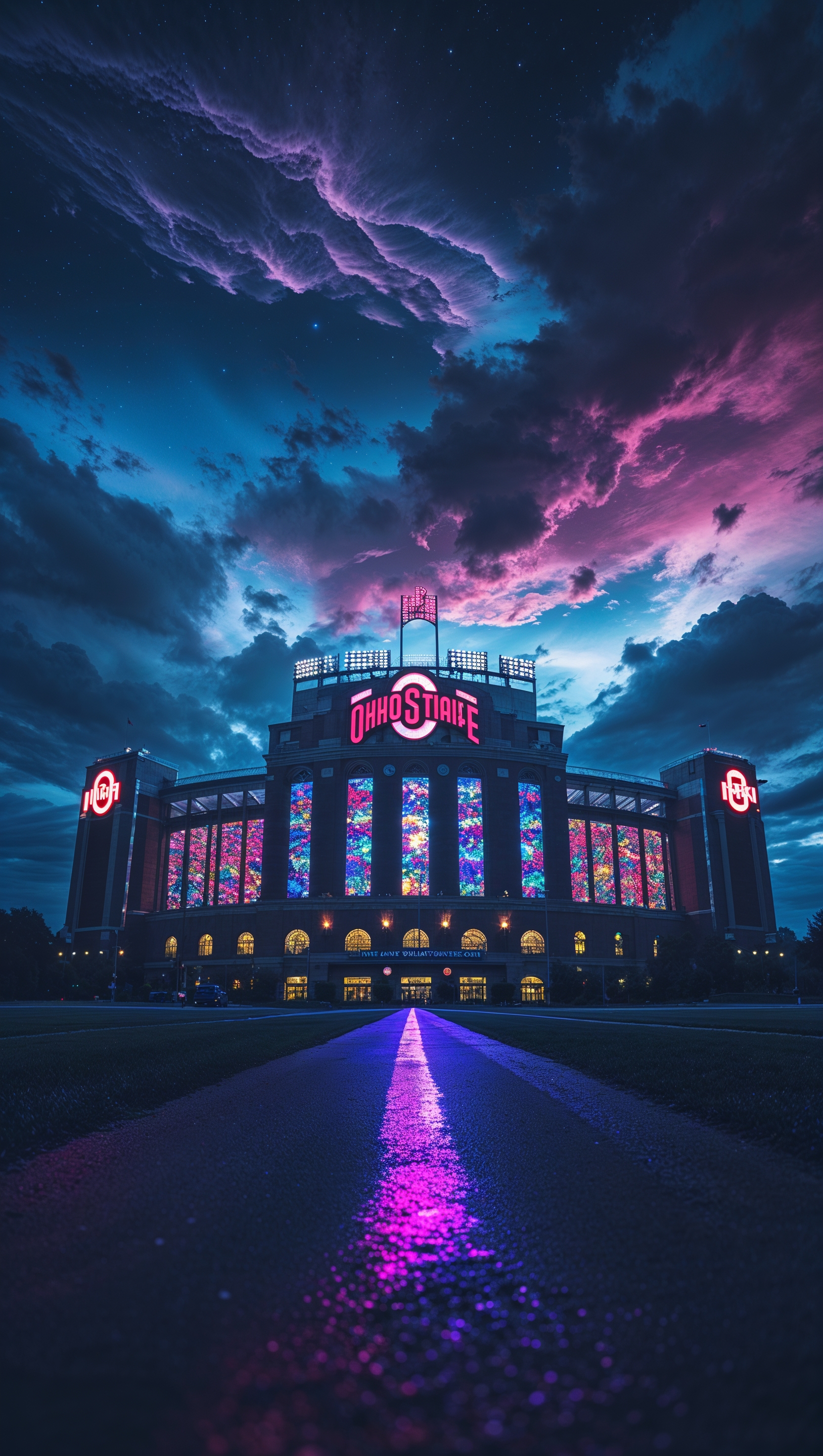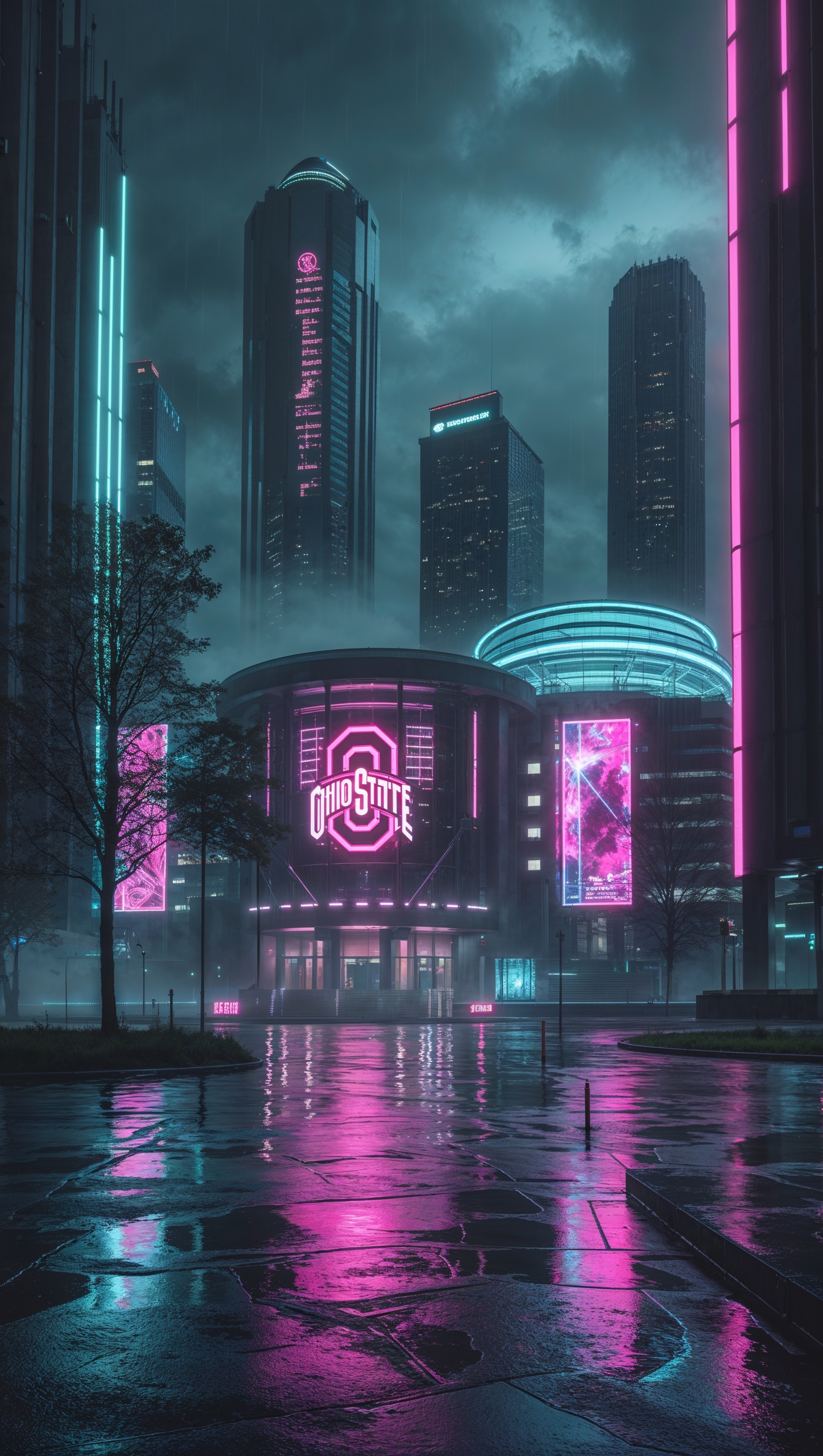 1664x2944 Ohio State University in cyberpunk style, neon lights and dark tones, iPhone wallpaper