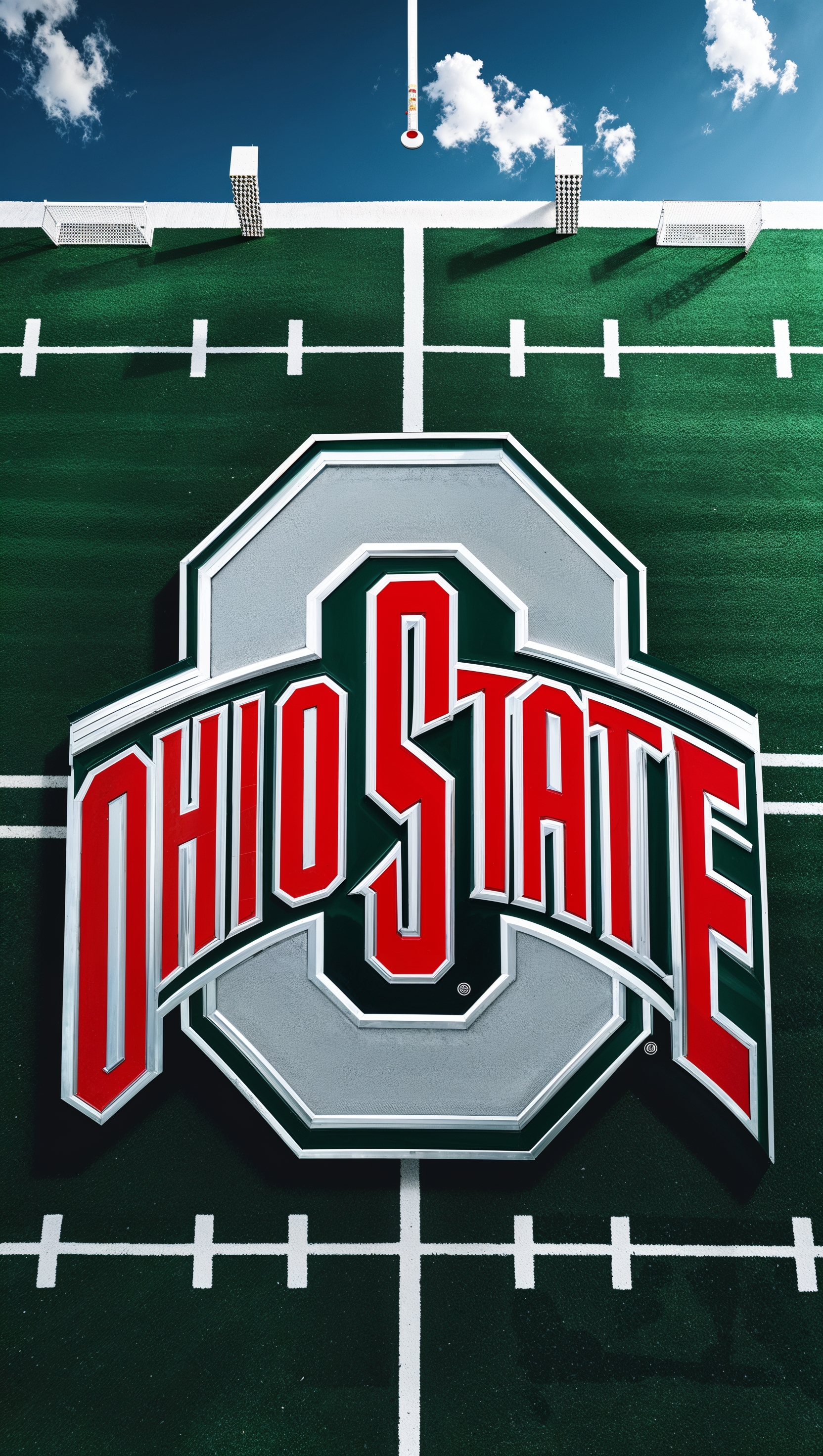 1664x2944 Ohio State University logo over a football field background, aerial view, iPhone wallpaper