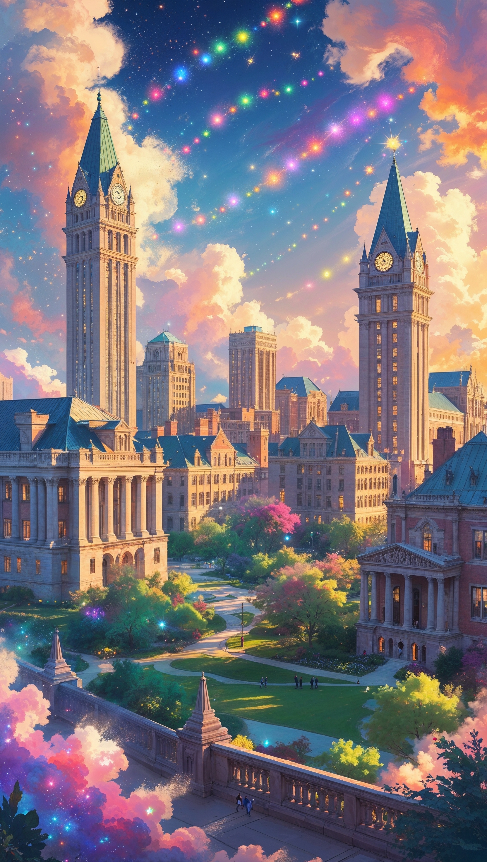 1664x2944 Fantasy version of Ohio State campus with floating buildings and magical sky, iPhone wallpaper