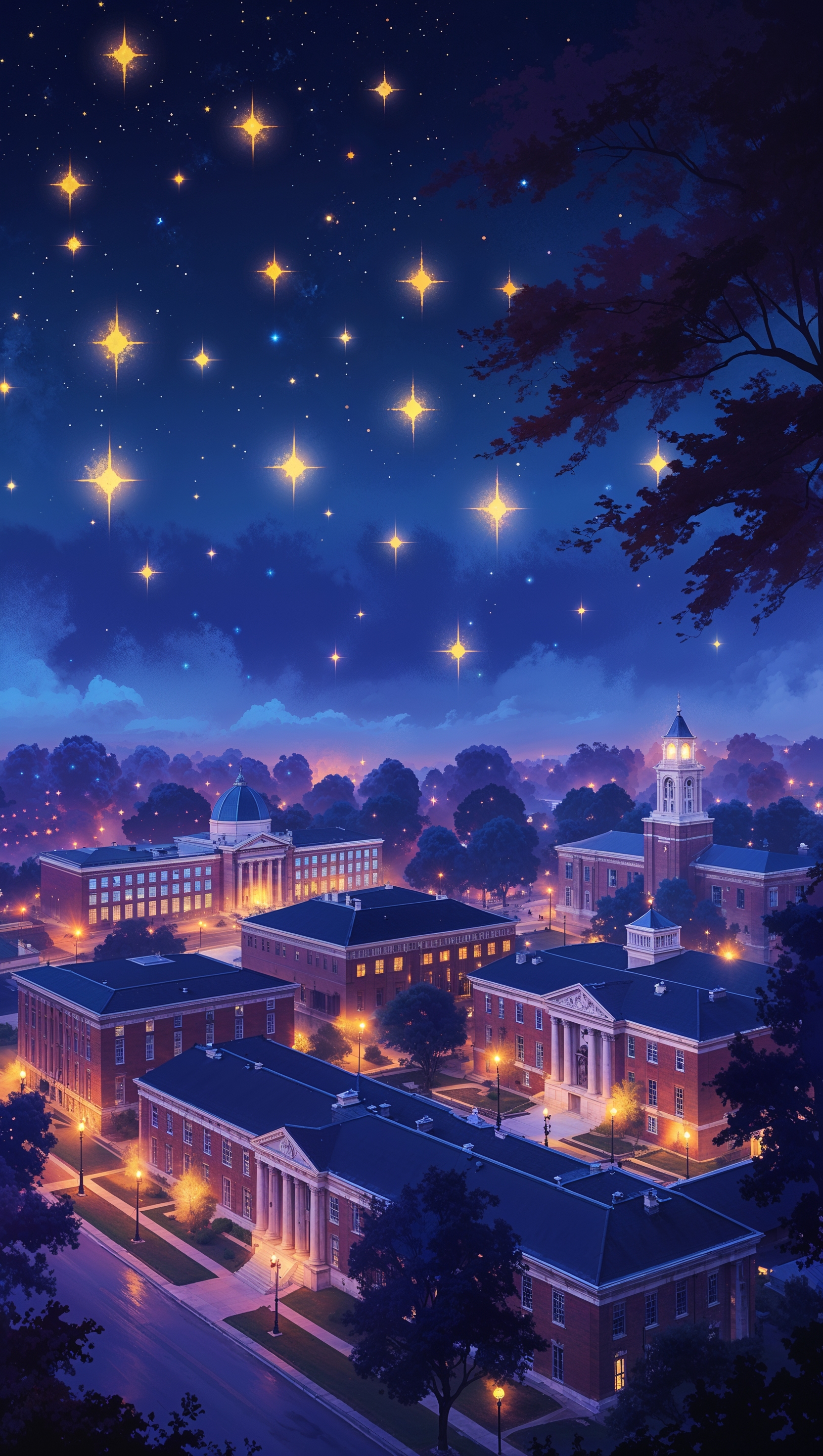 1664x2944 Digital painting of Ohio State campus at night with glowing stars, dreamy iPhone wallpaper