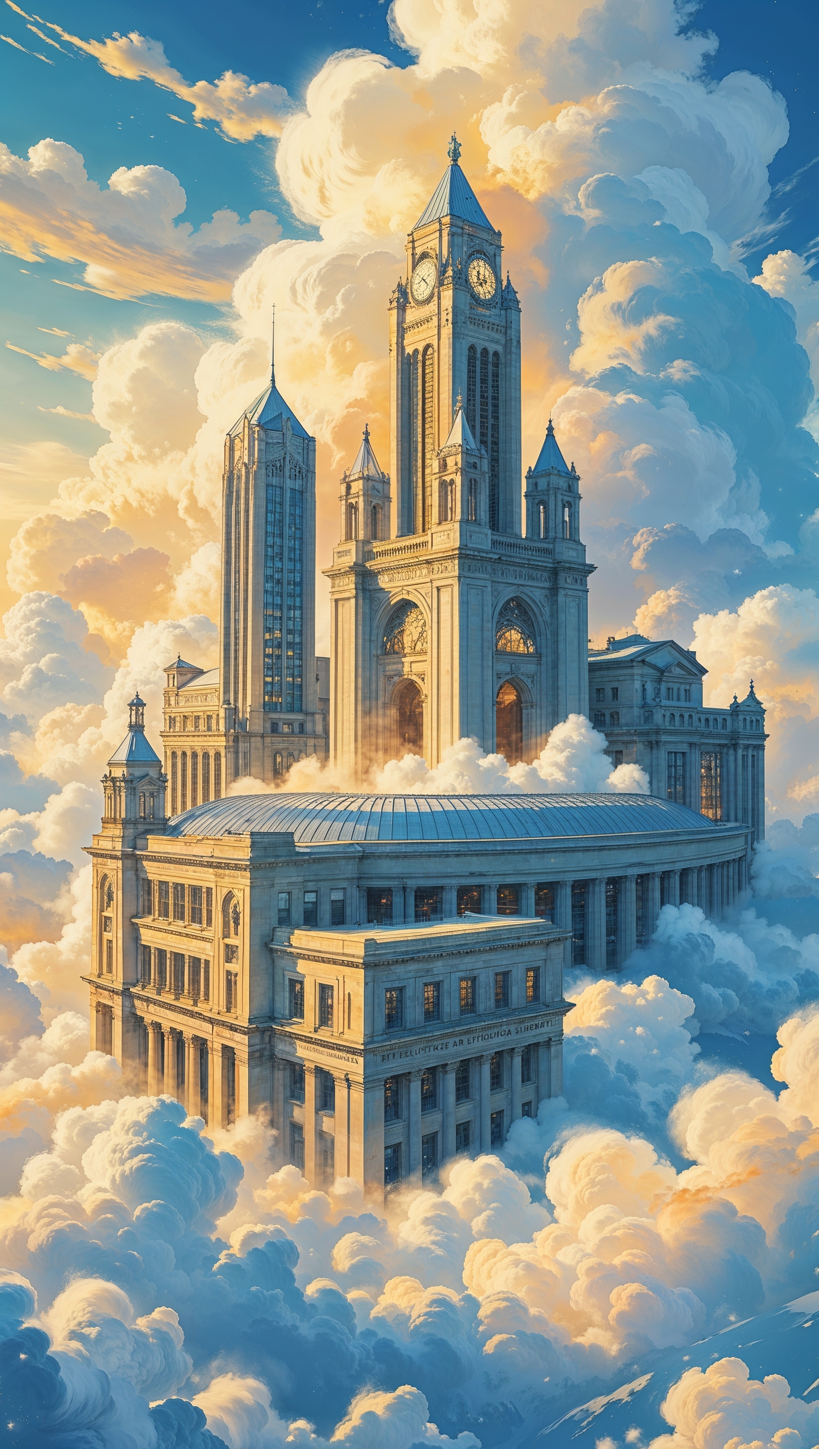 1664x2944 Surreal version of Ohio State University rising through the clouds, fantasy style, iPhone wallpaper