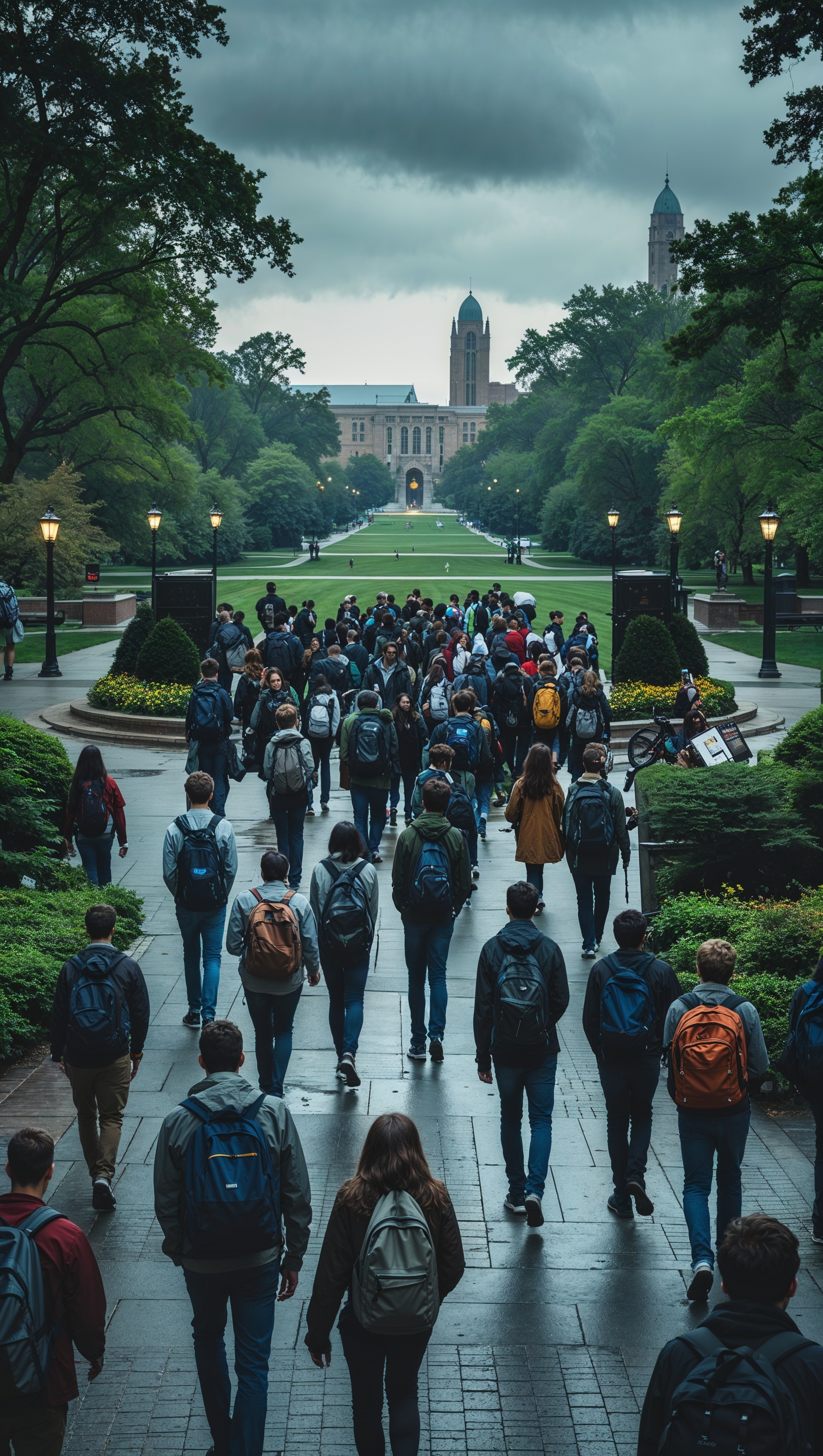1664x2944 Cinematic view of students walking on the Oval at Ohio State, overcast weather, iPhone wallpaper