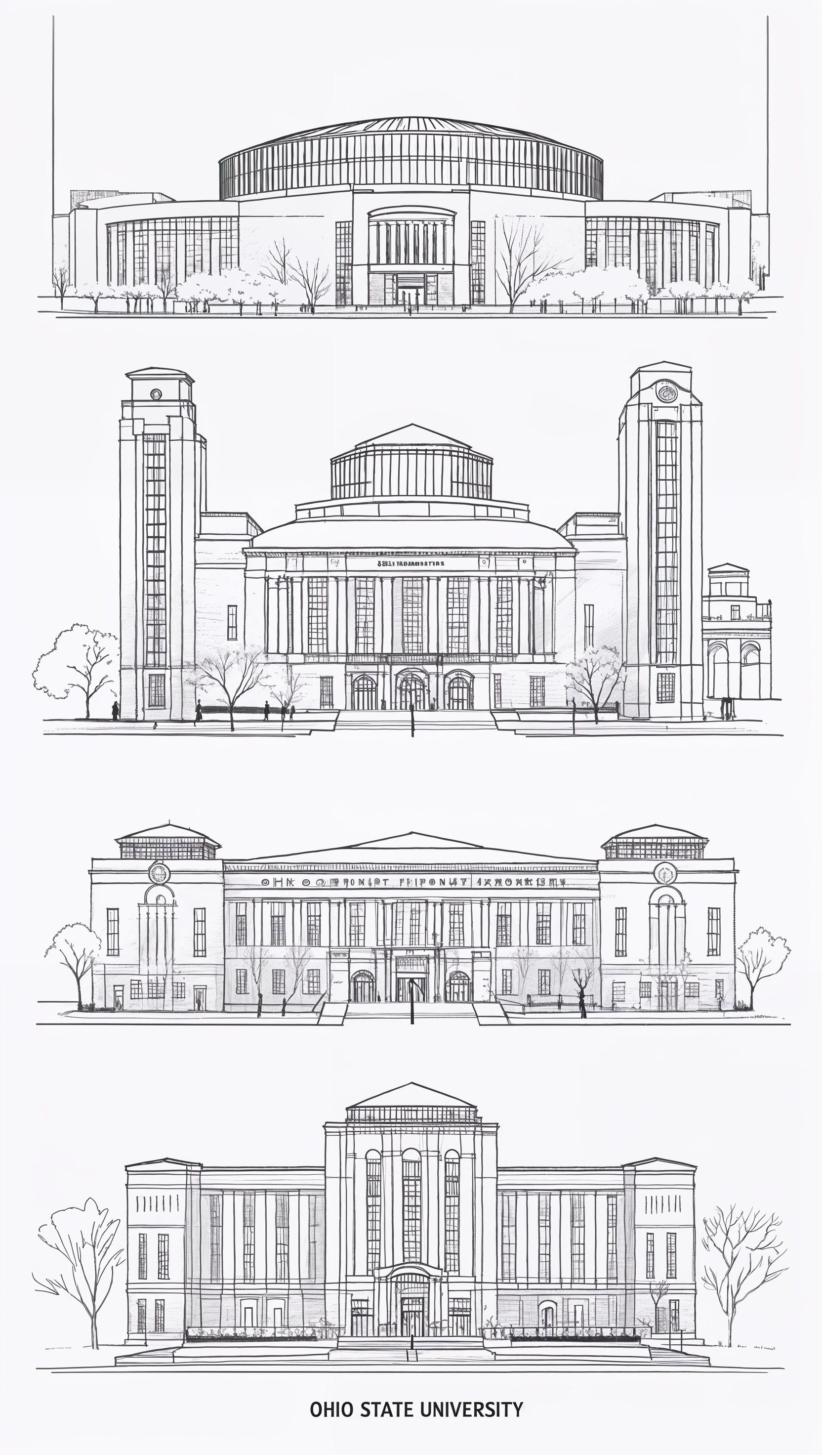1664x2944 Line art of Ohio State campus buildings, black and white sketch, minimalist iPhone wallpaper