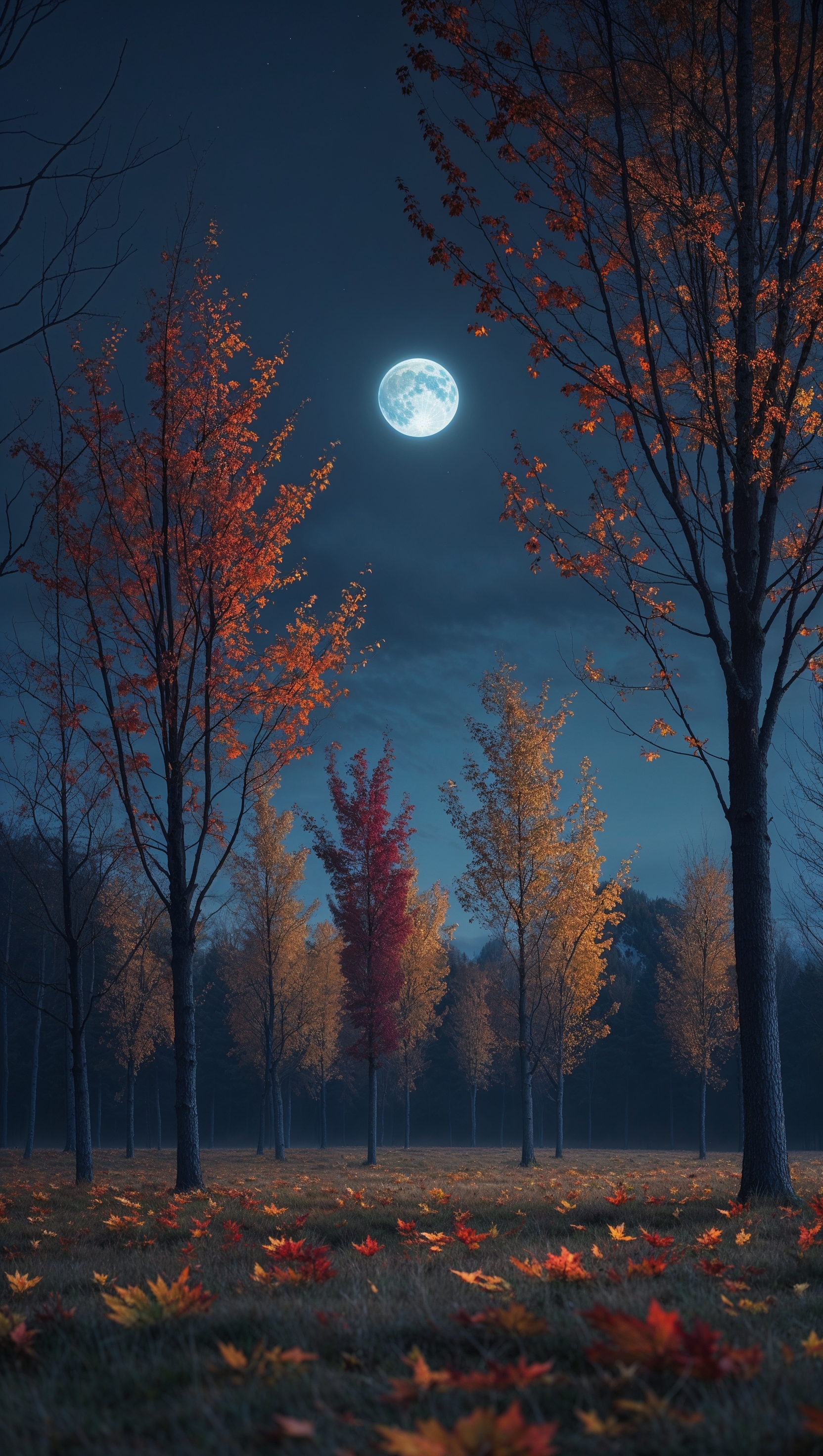 1664x2944 A moonlit night in September with trees shedding their leaves