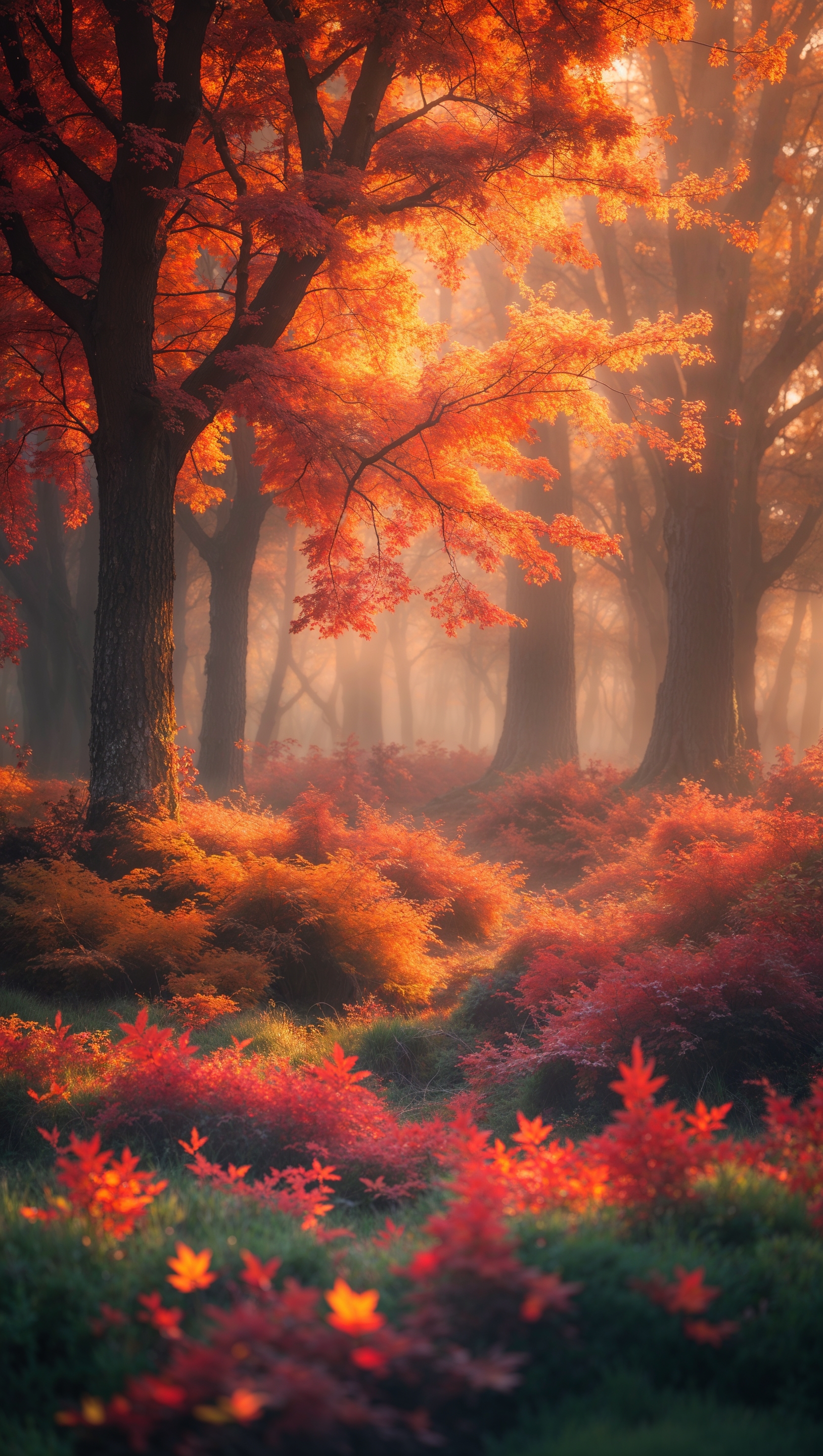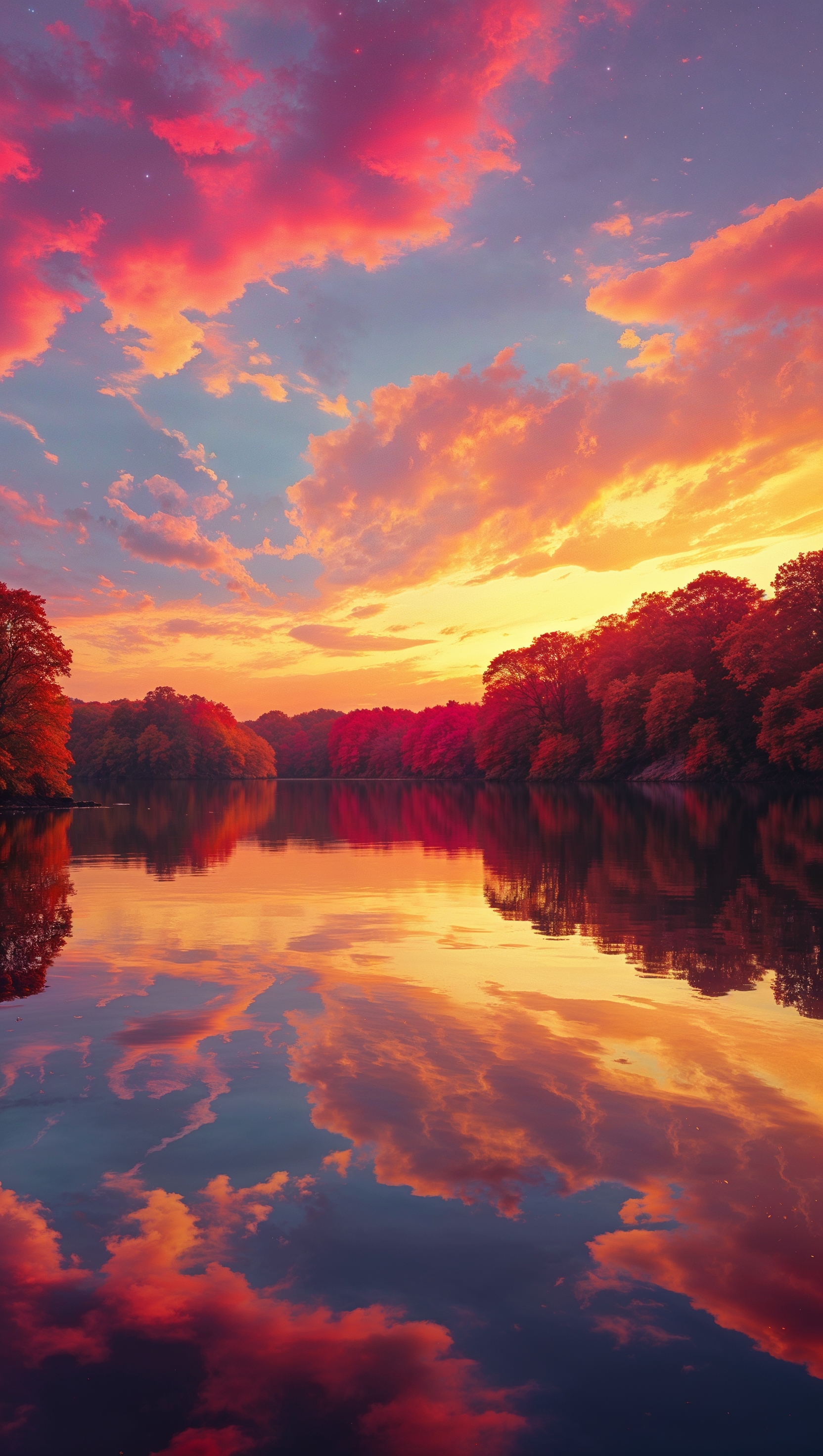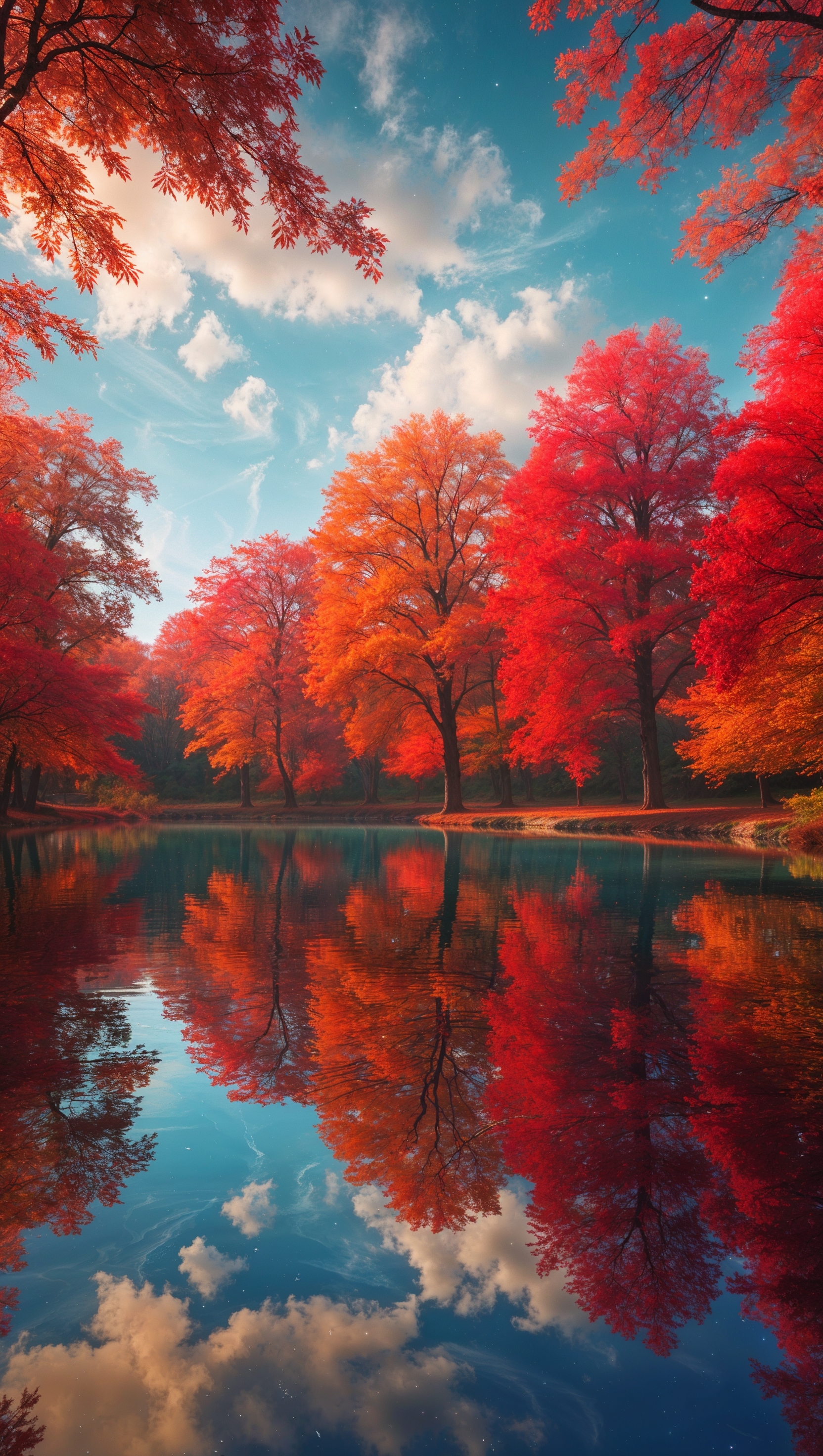 1664x2944 A serene pond surrounded by red and orange trees in September