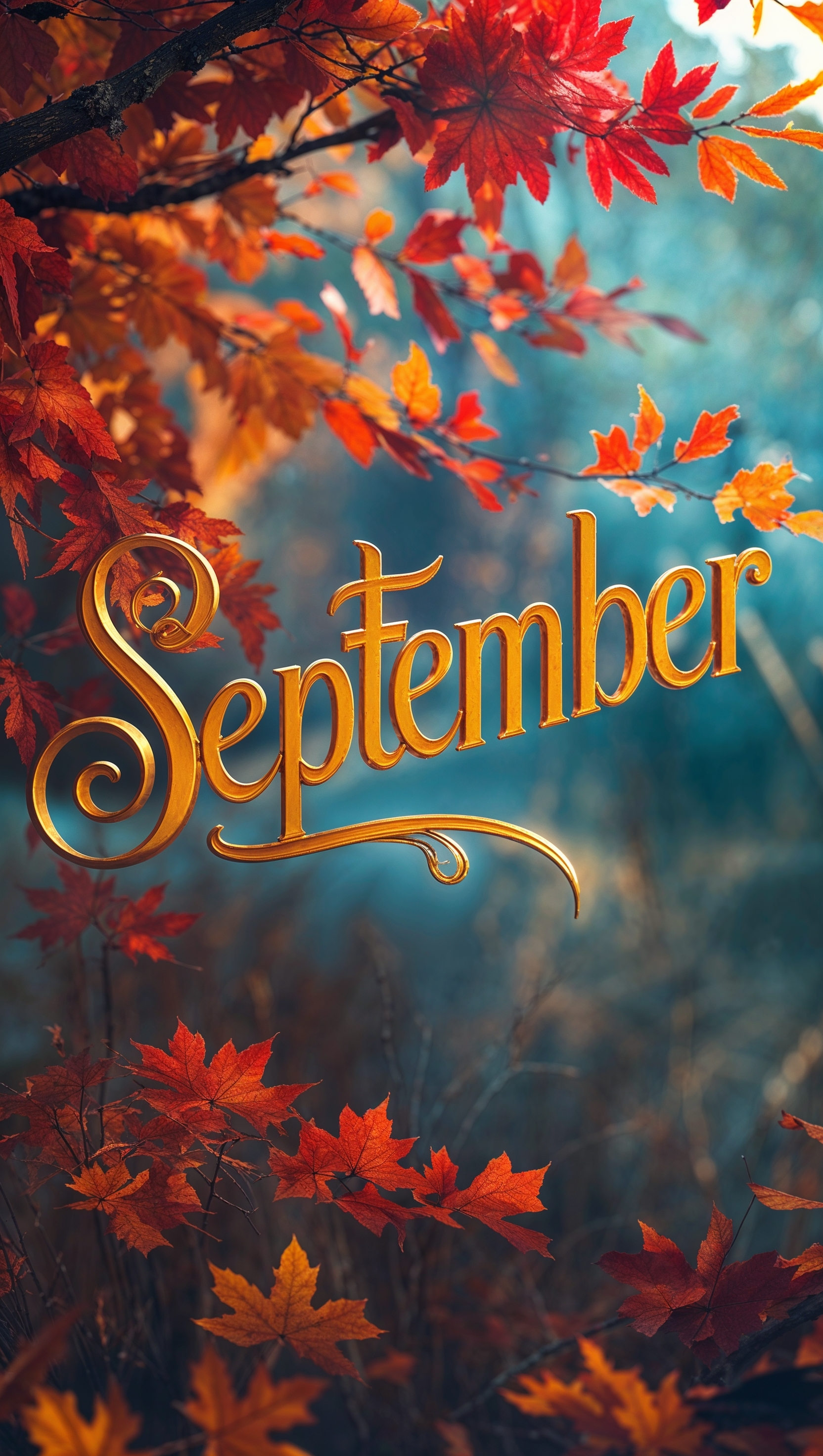 1664x2944 The word 'September' in elegant font over a background of autumn leaves