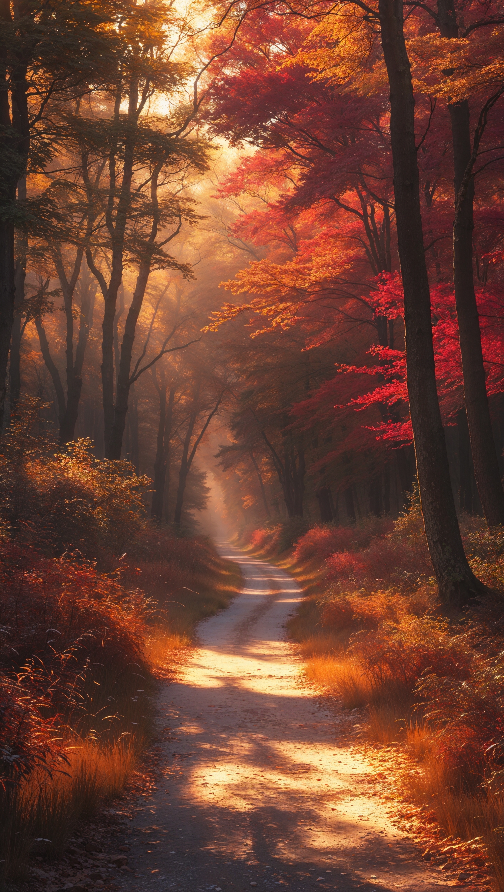 1664x2944 A walking trail in an autumn forest with soft sunlight in September