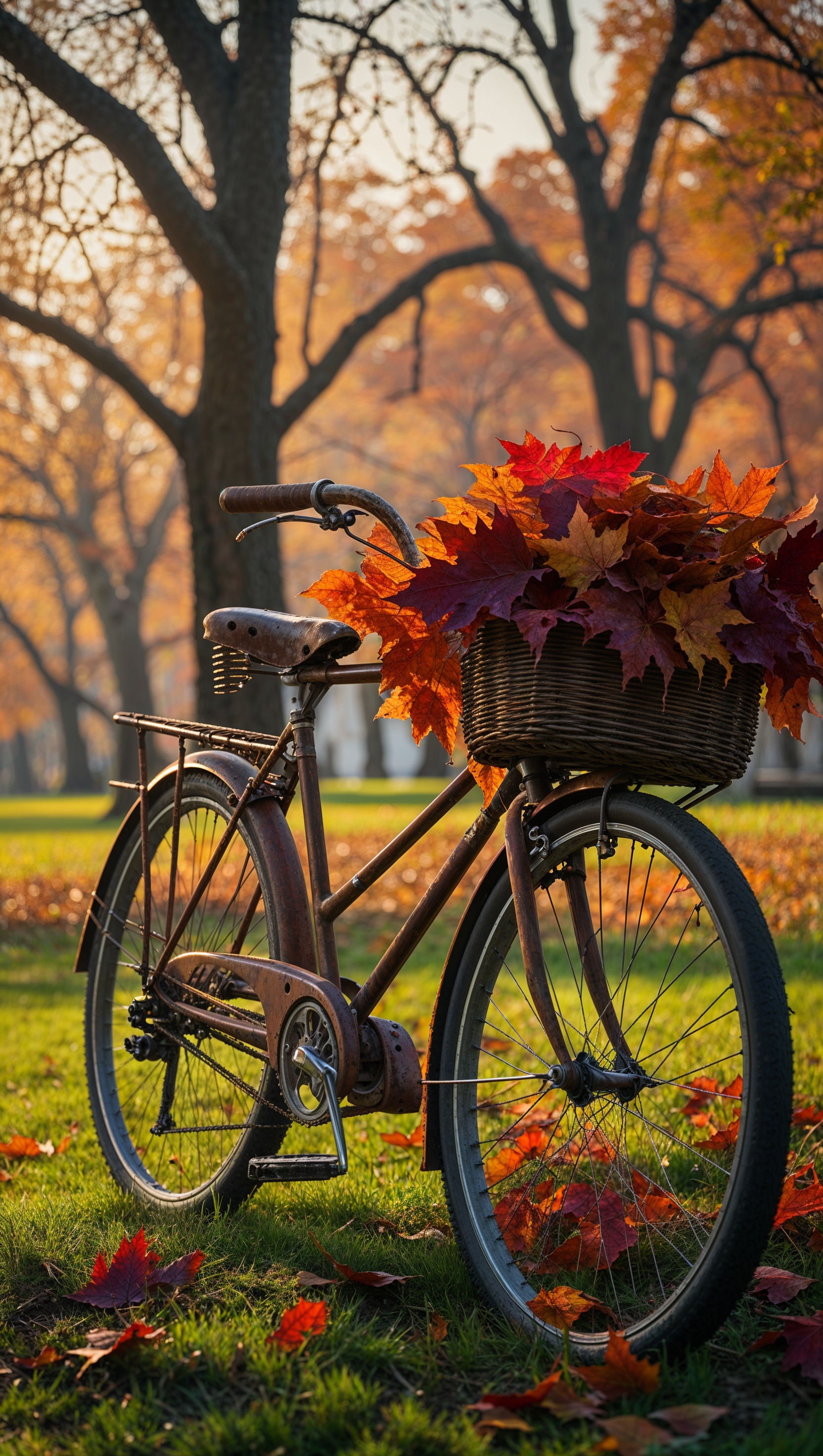 1664x2944 A bicycle by an autumn park with a basket full of colorful leaves