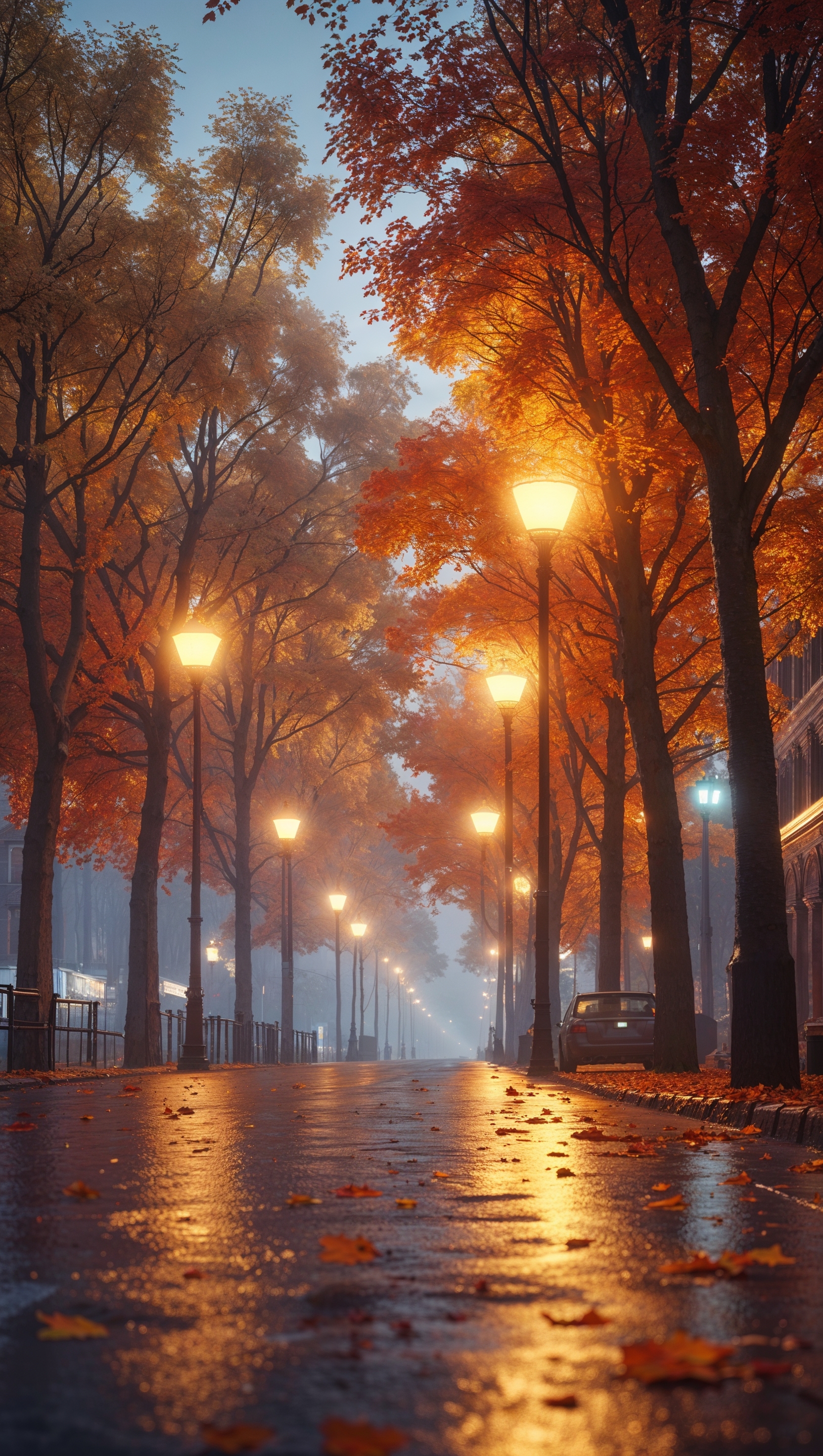 1664x2944 A street in September with autumn trees and glowing streetlights