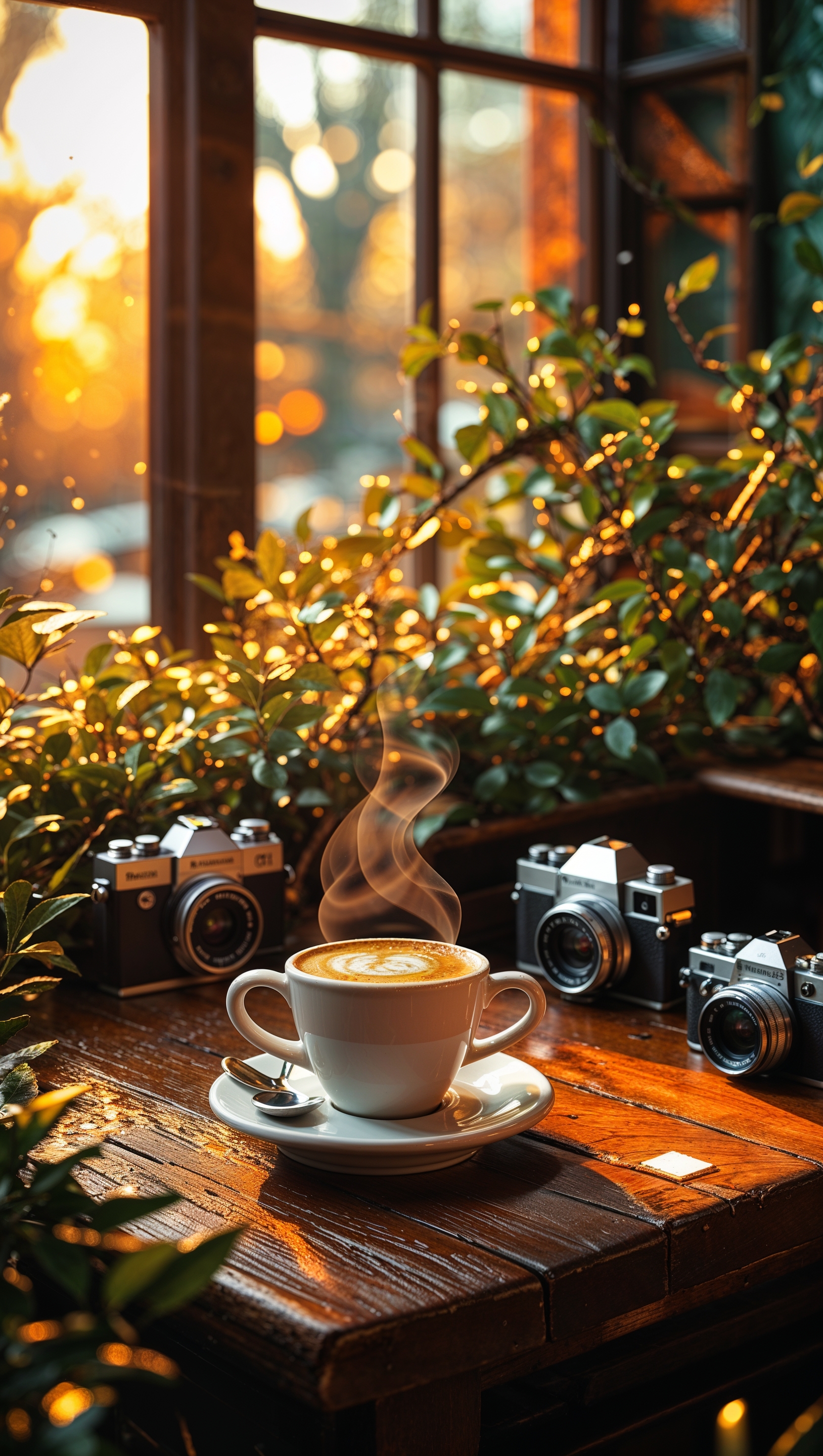 1664x2944 A cozy café in September with a cup of coffee on a wooden table