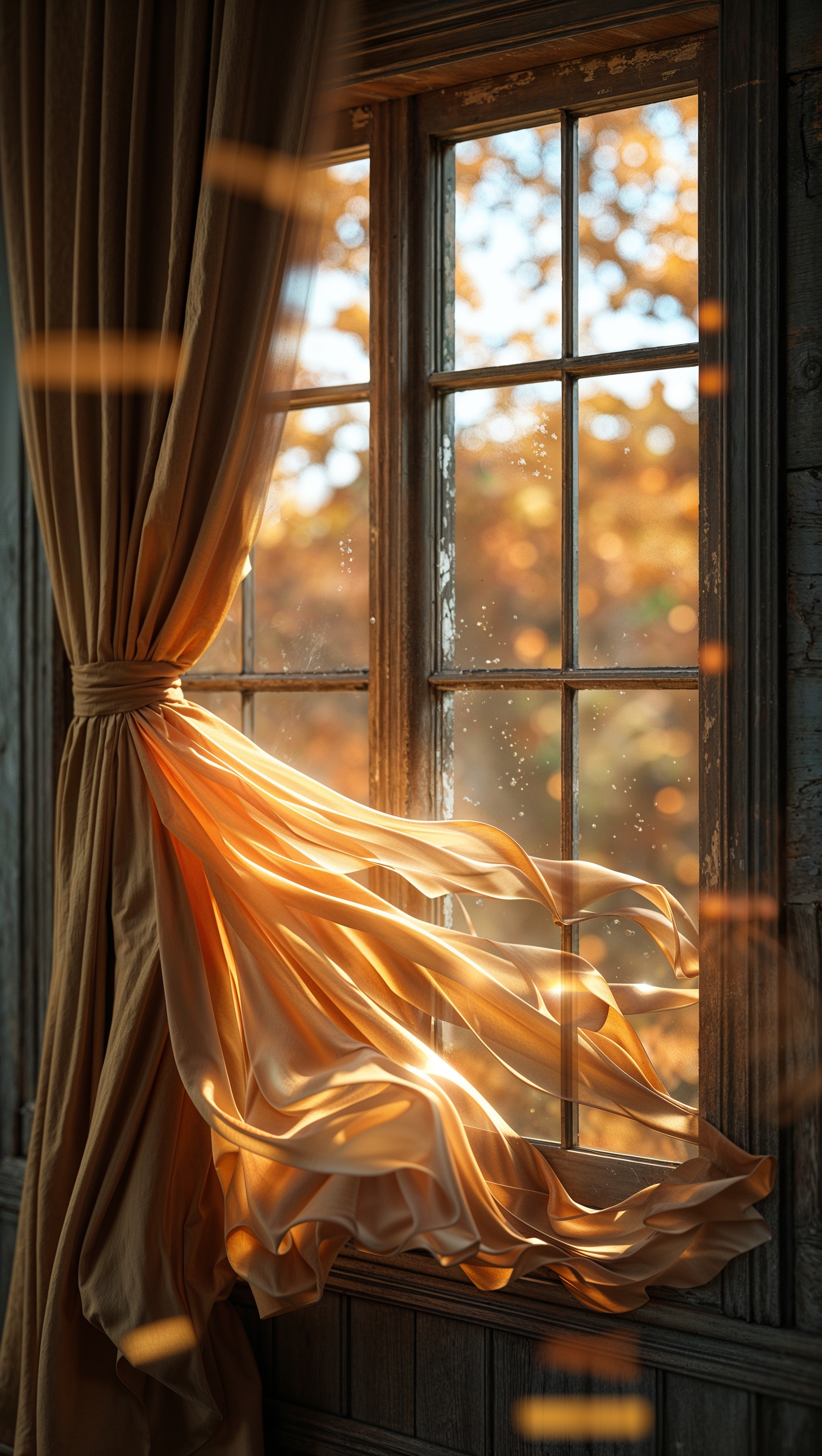 1664x2944 A window with half-open curtains and an autumn breeze in September