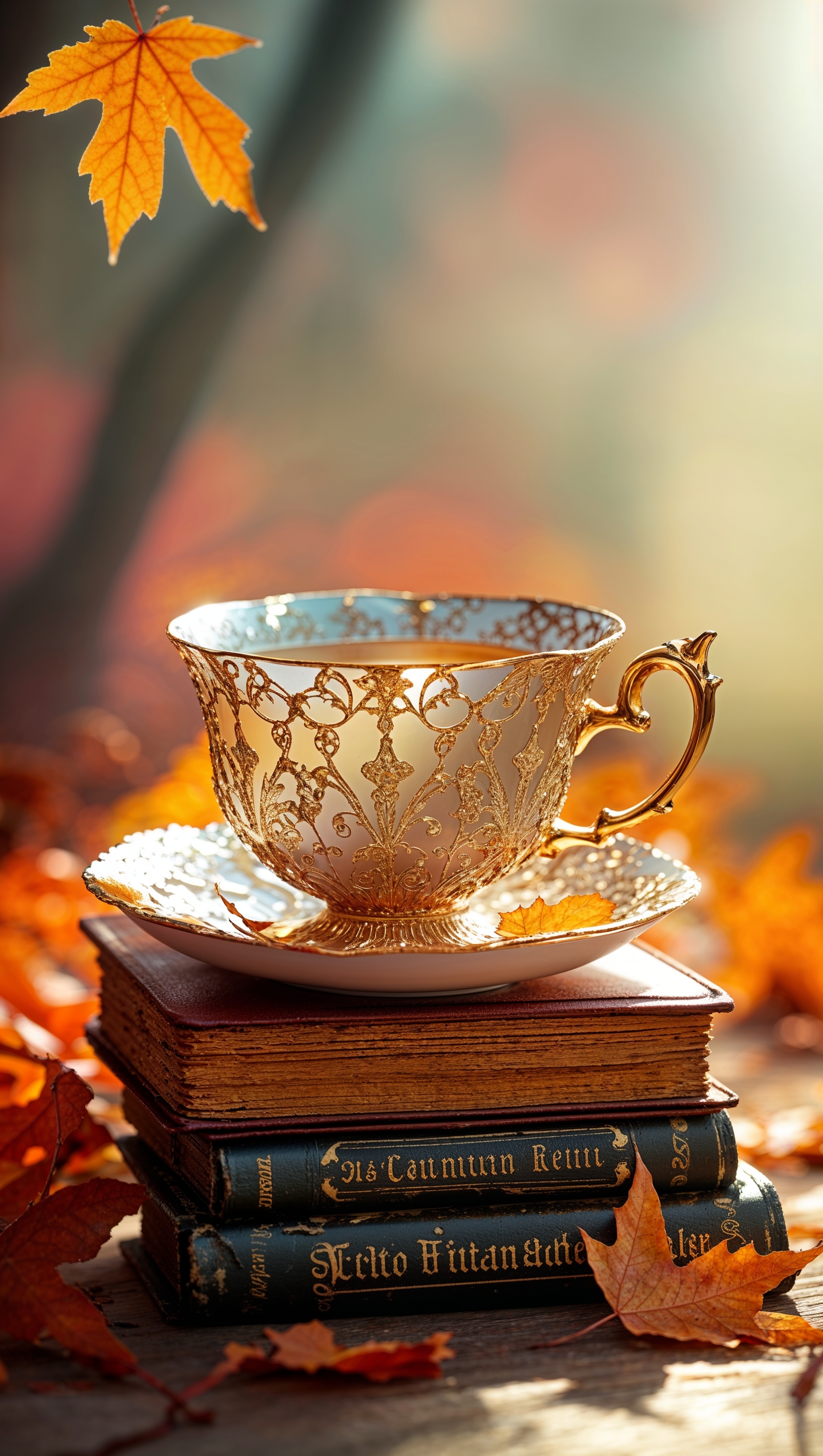 1664x2944 September vibes: A fantasy illustration of a tea cup and autumn books