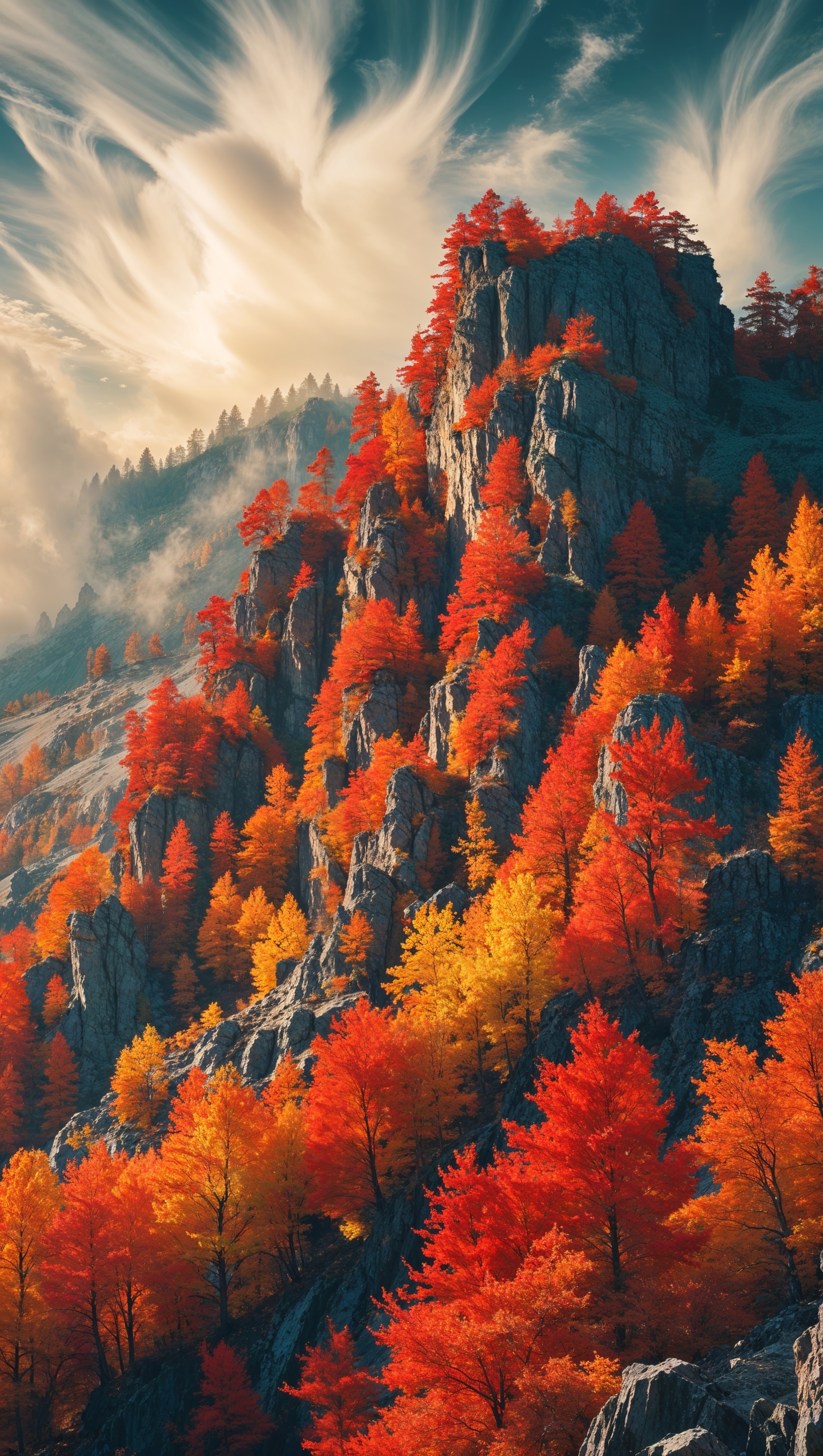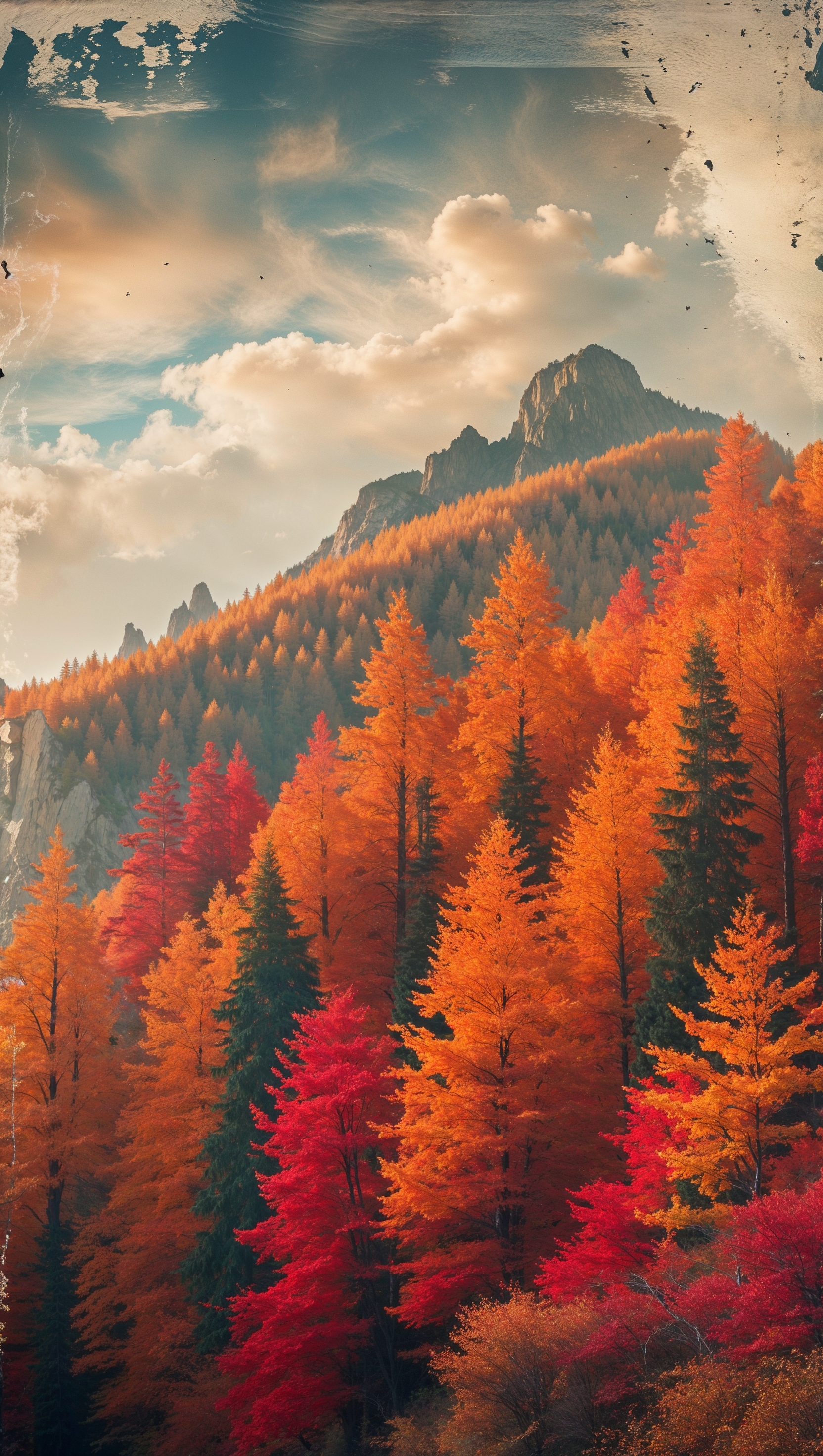 1664x2944 A mountain landscape with autumn trees and a soft cloudy sky in September