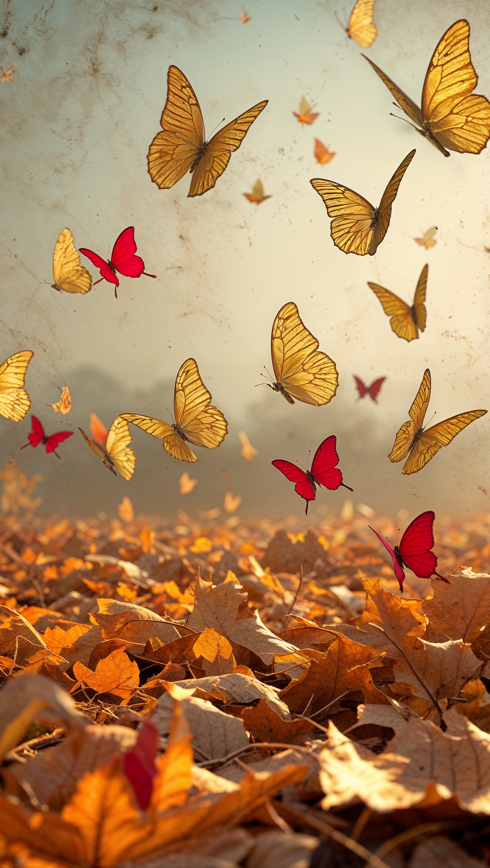 1664x2944 Golden butterflies among autumn leaves for iPhone wallpaper