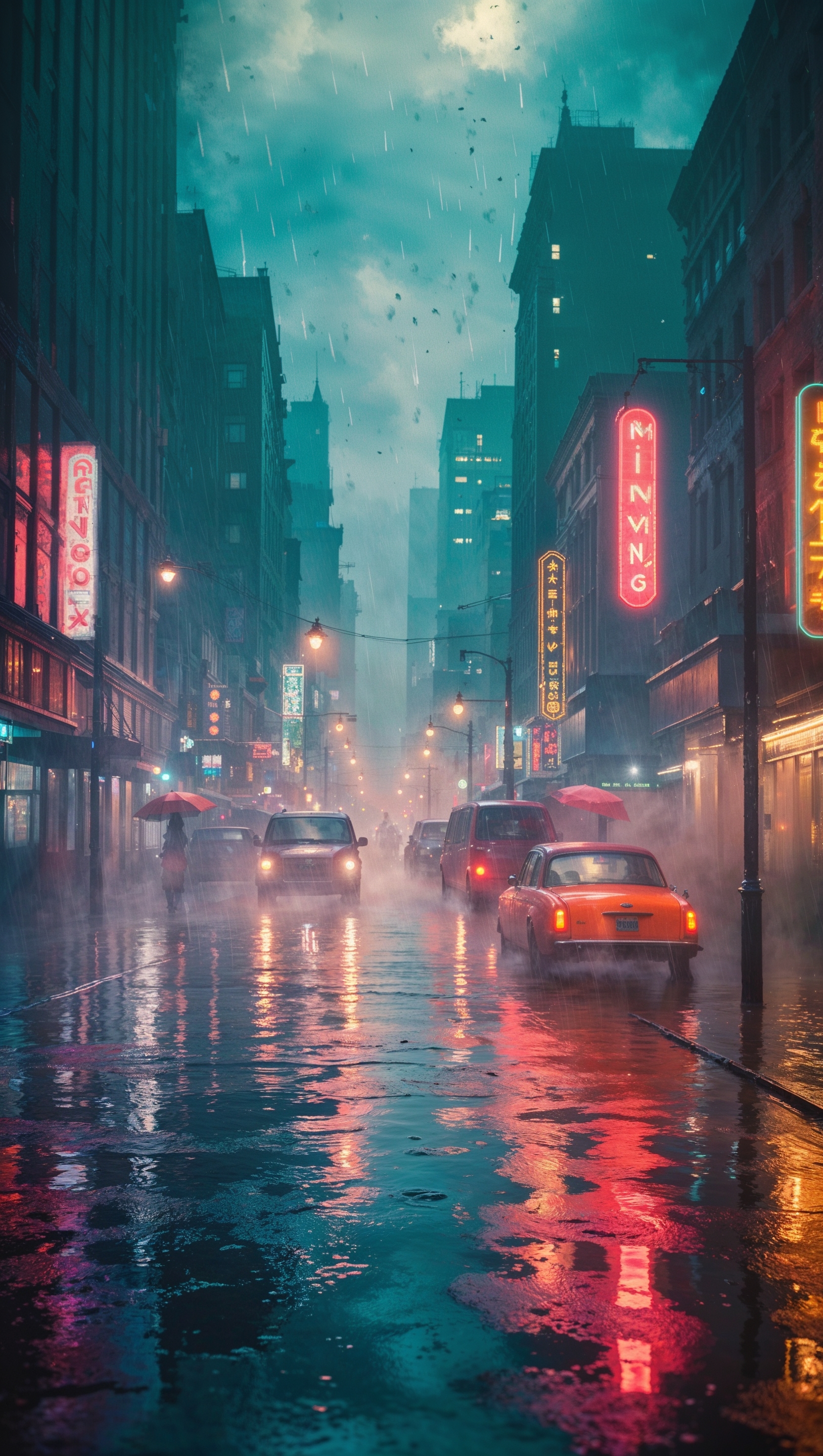 1664x2944 A watercolor-style painting of a city in rainy September weather