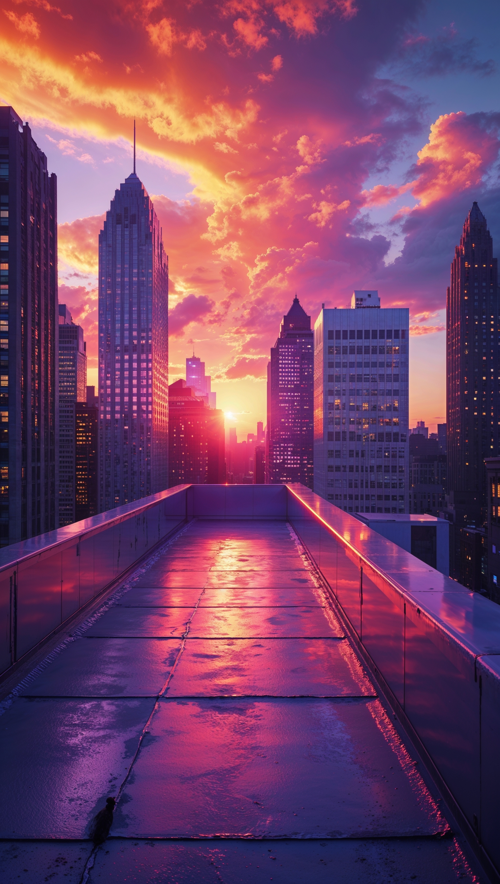 1664x2944 A city rooftop in September with a sunset sky and illuminated buildings