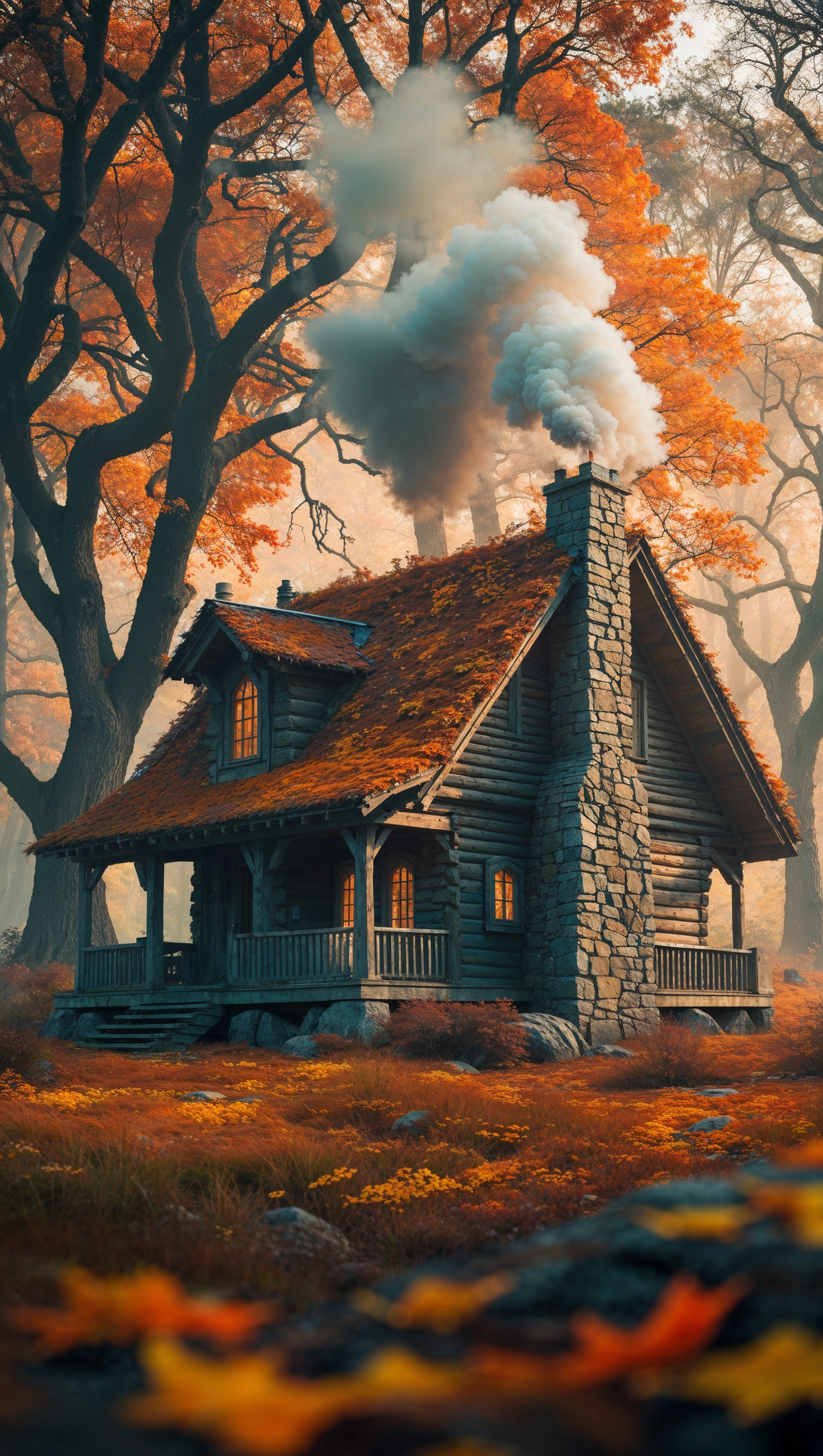 1664x2944 A cozy wooden cabin in a September forest with smoke coming from the chimney