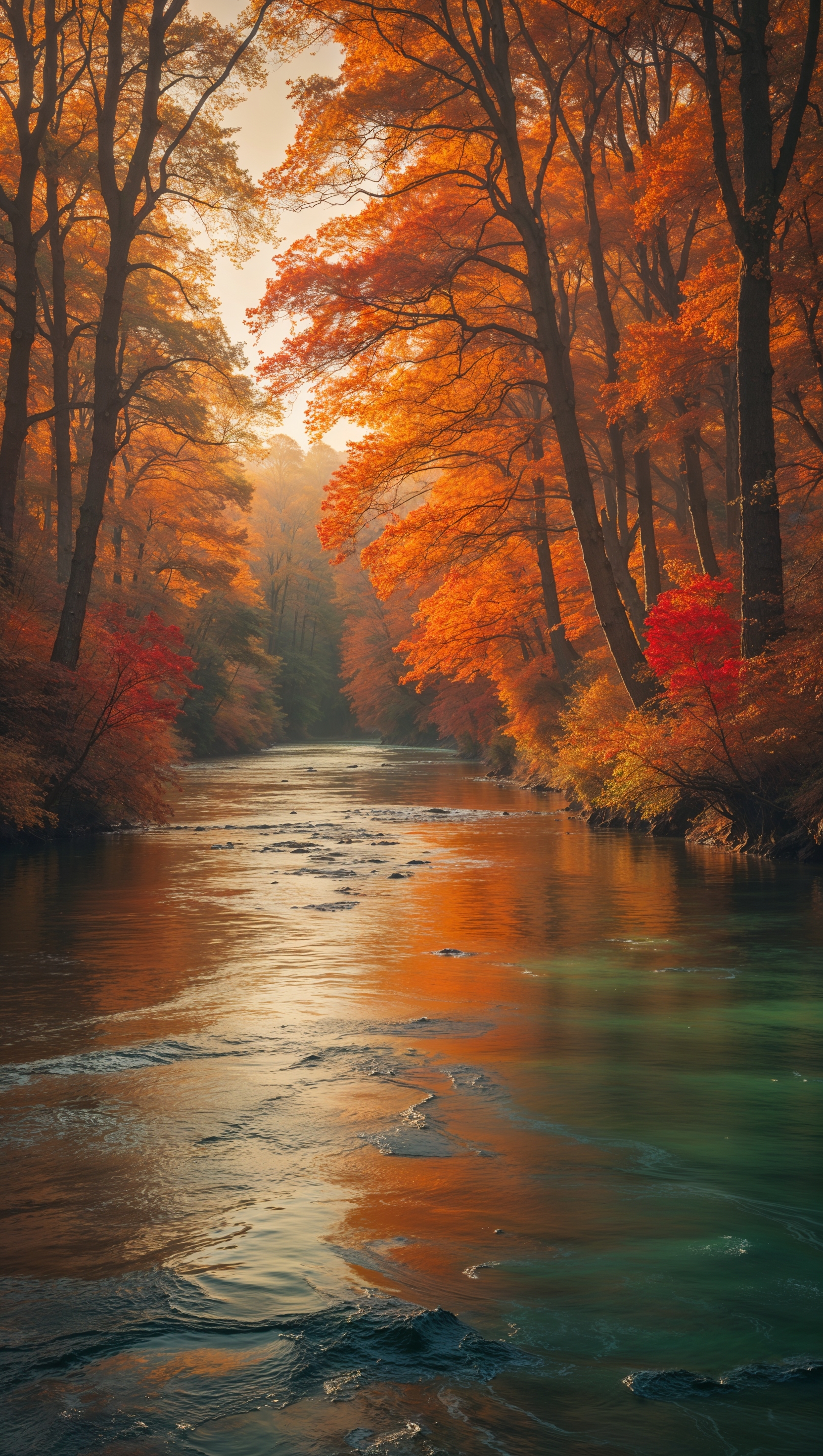 1664x2944 A river flowing through an autumn forest in September with golden sunlight