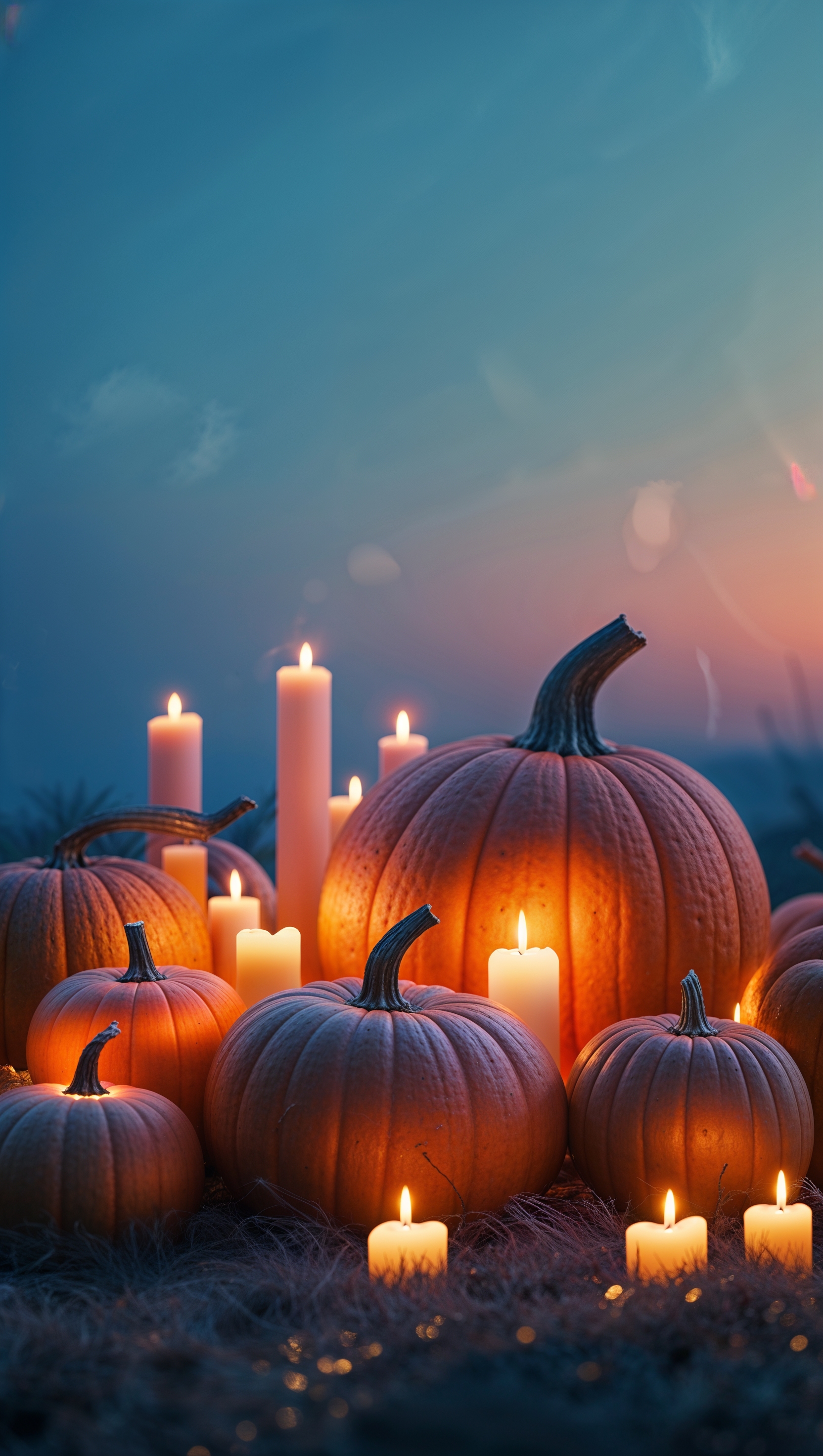1664x2944 A minimal illustration of autumn pumpkins and lit candles in September