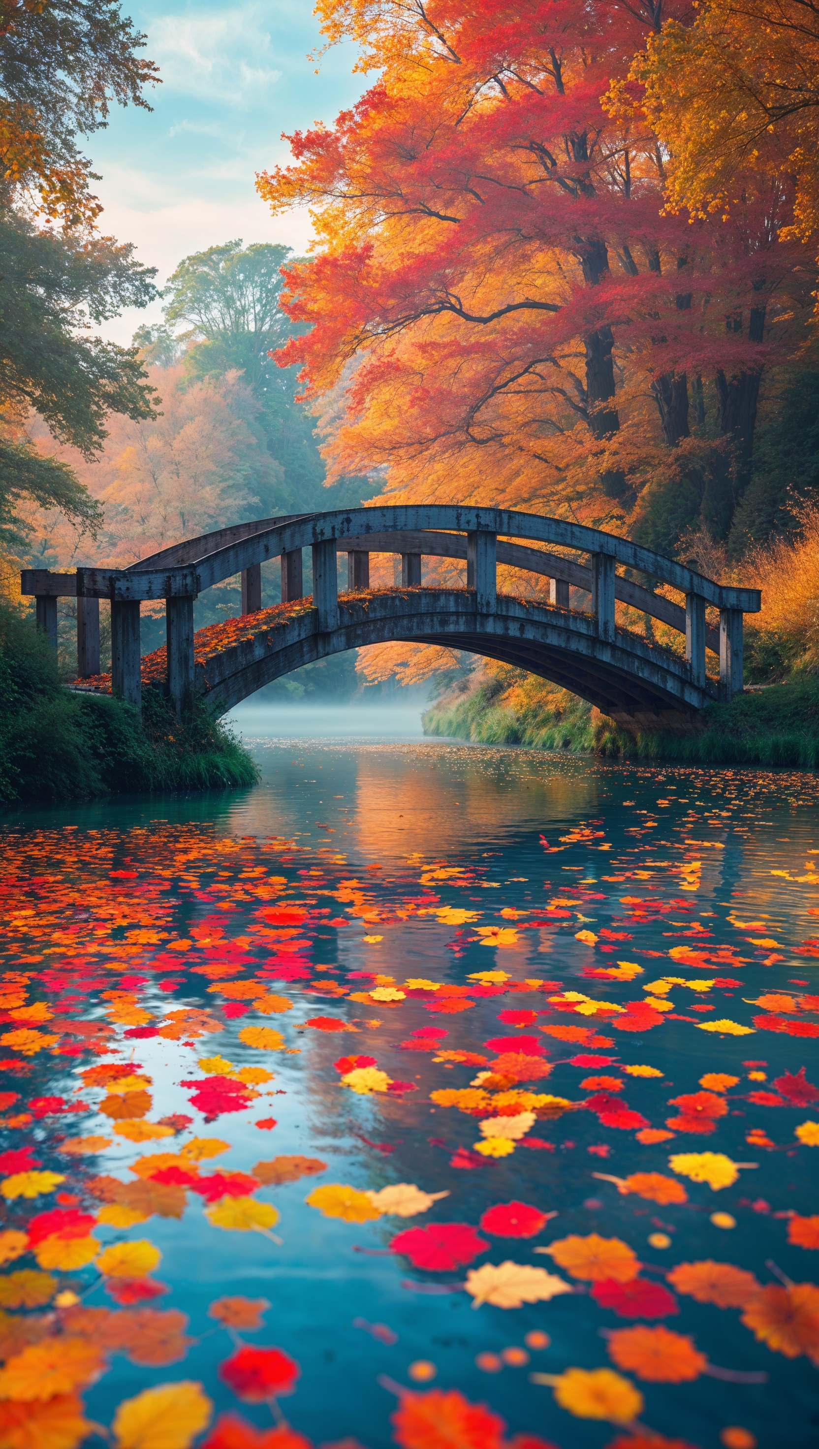 1664x2944 A wooden bridge over a river with floating leaves in September