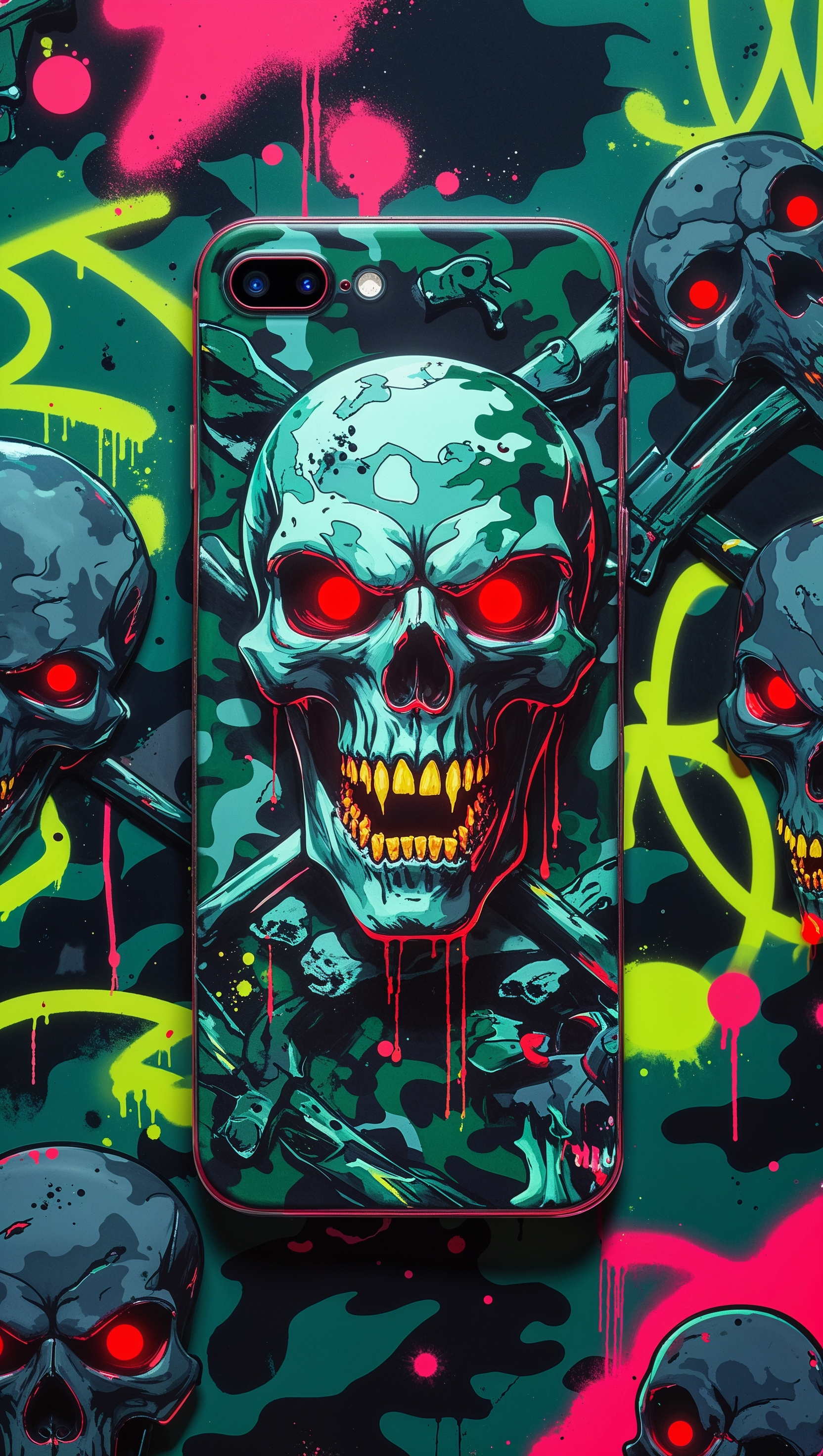 1664x2944 Graffiti-style camo with skull details, rebellious iPhone theme