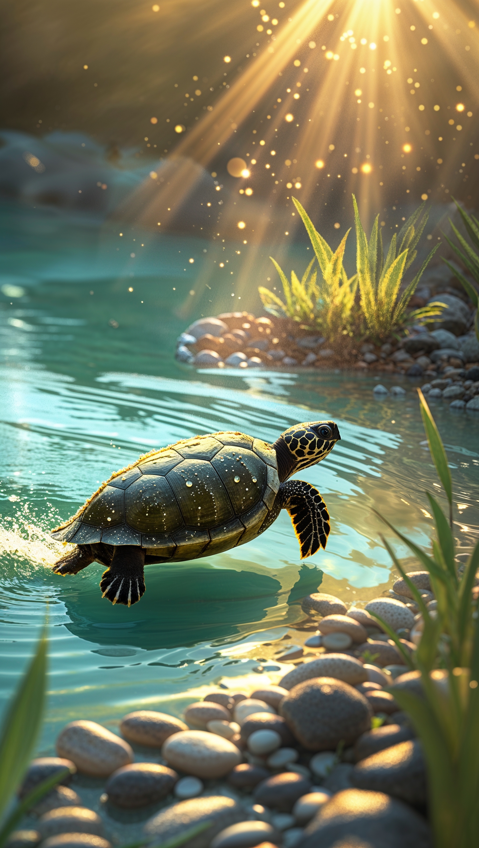 1664x2944 A turtle swimming toward sunlight in shallow water