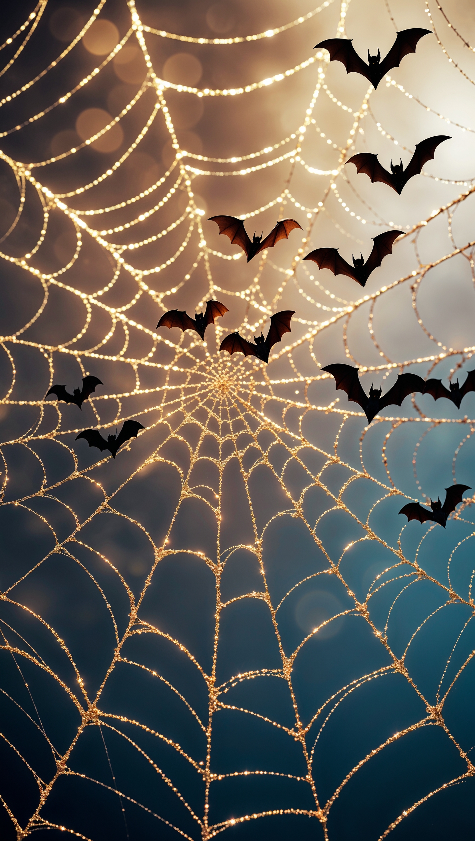 1664x2944 iPhone wallpaper with shiny spider webs and flying bats