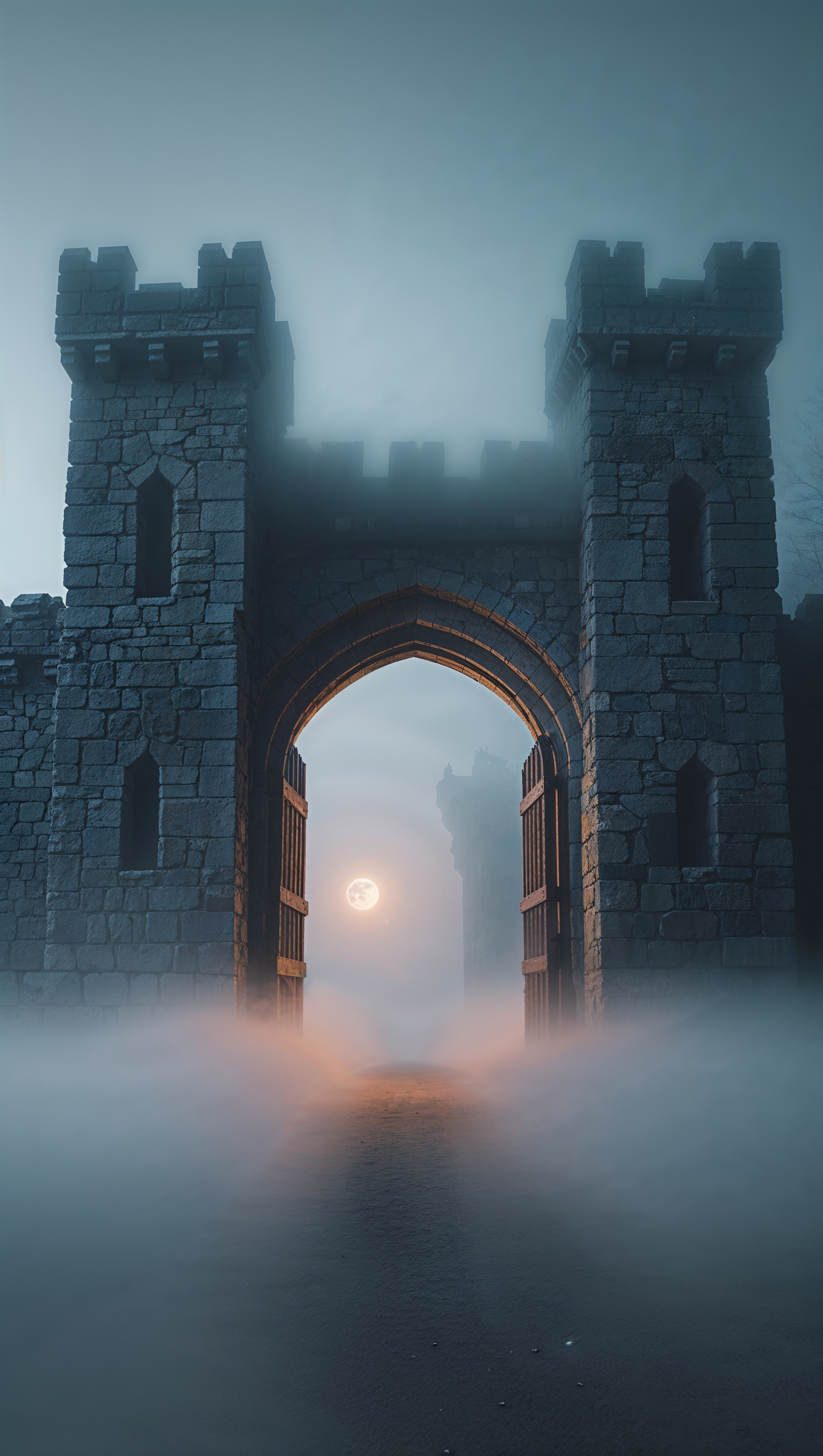 1664x2944 iPhone wallpaper with old castle gate and white fog