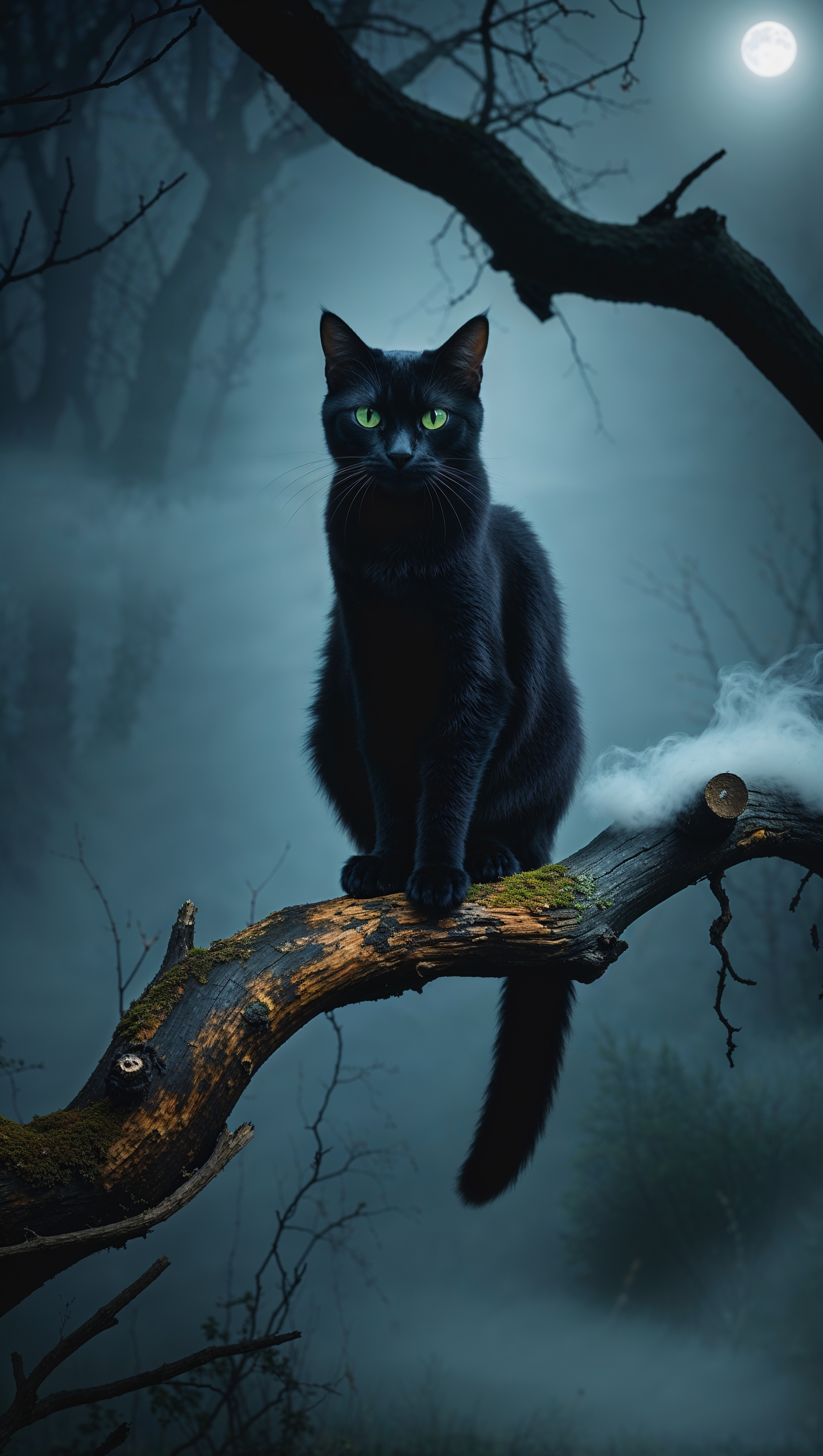 1664x2944 iPhone wallpaper with black cat on branch in foggy night