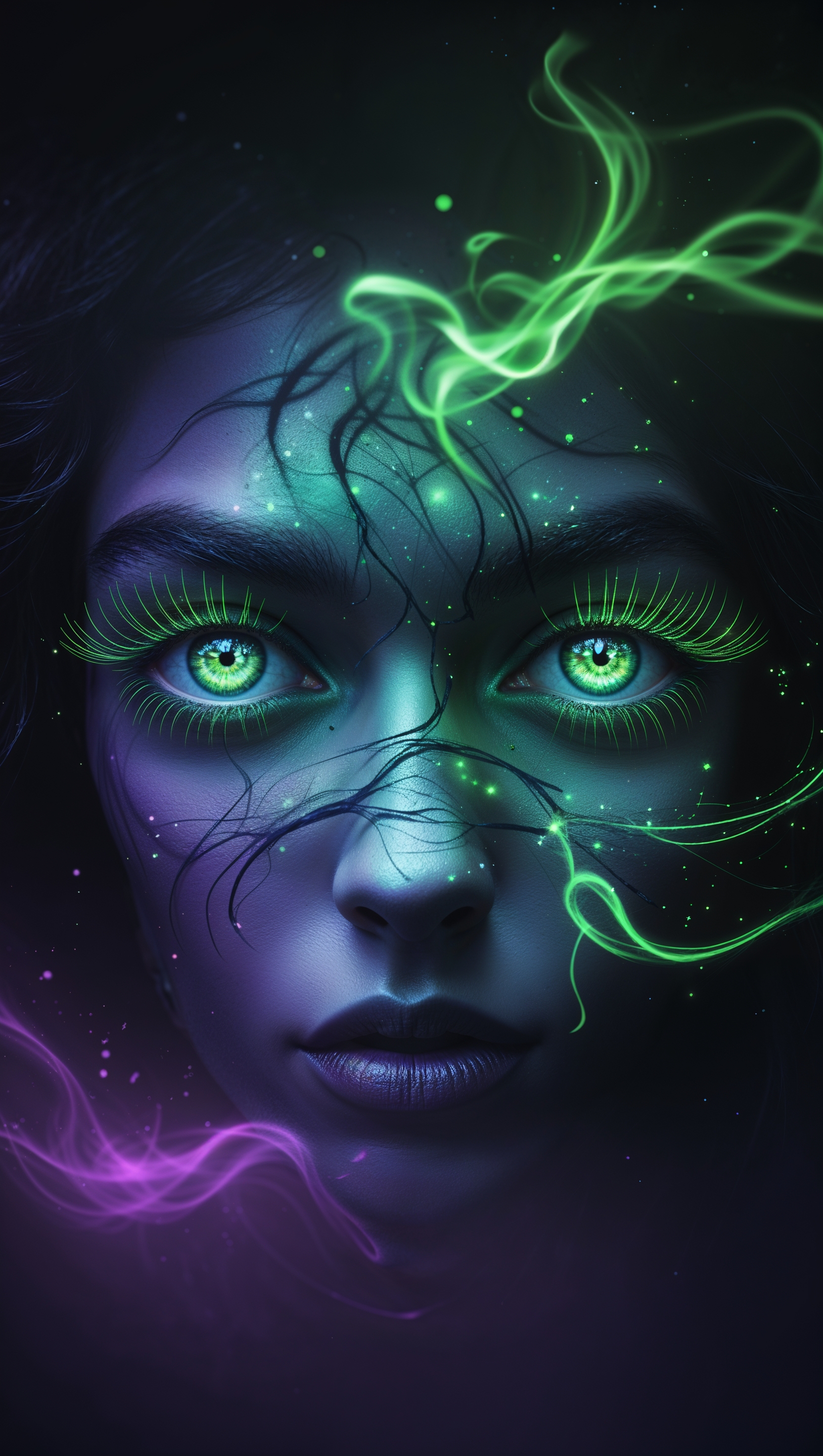 1664x2944 iPhone wallpaper with witchy eyes and green neon effects