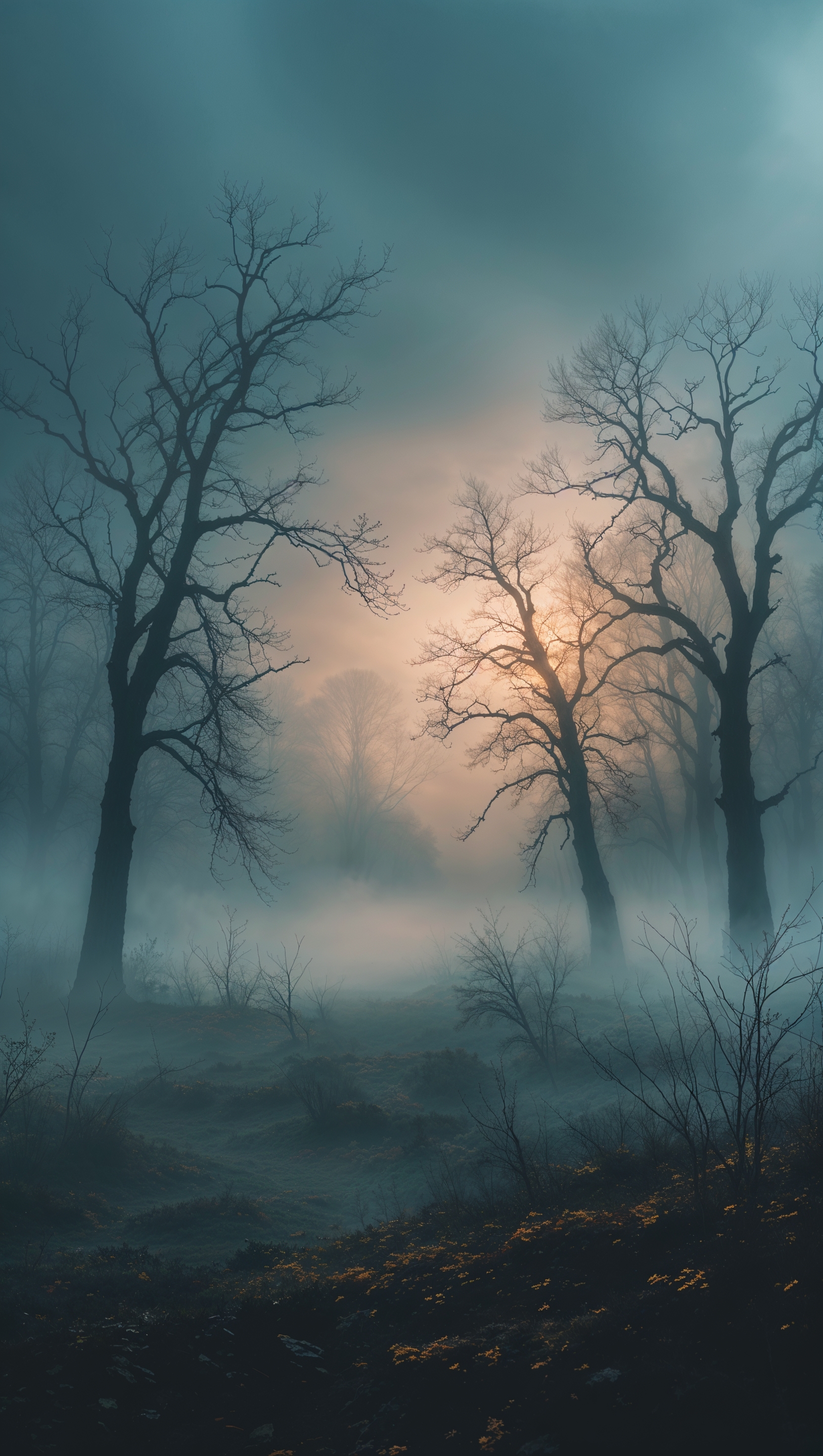 1664x2944 iPhone wallpaper with spooky autumn theme, dense fog and bare trees