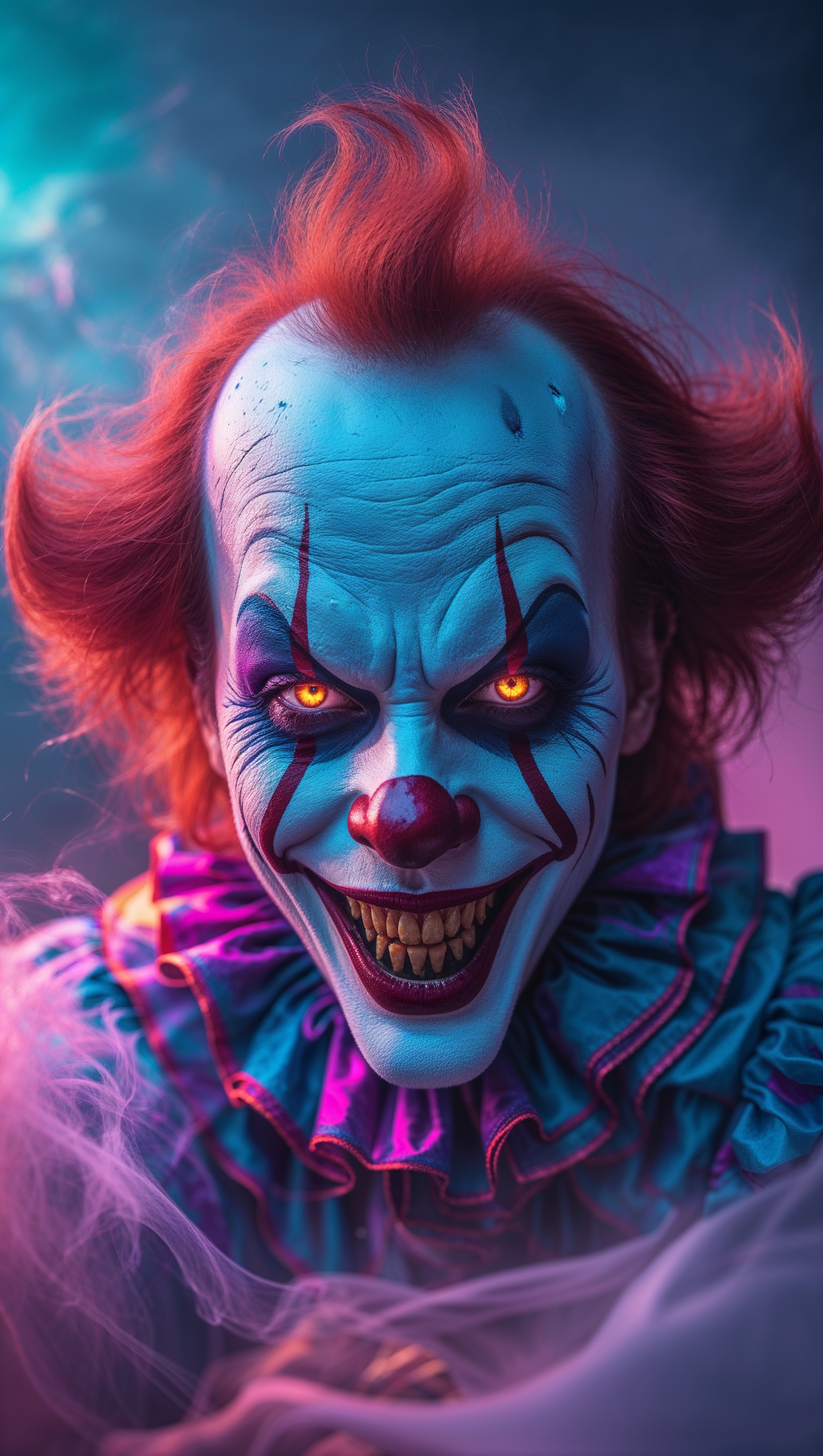 1664x2944 iPhone wallpaper with scary clown and colorful mist