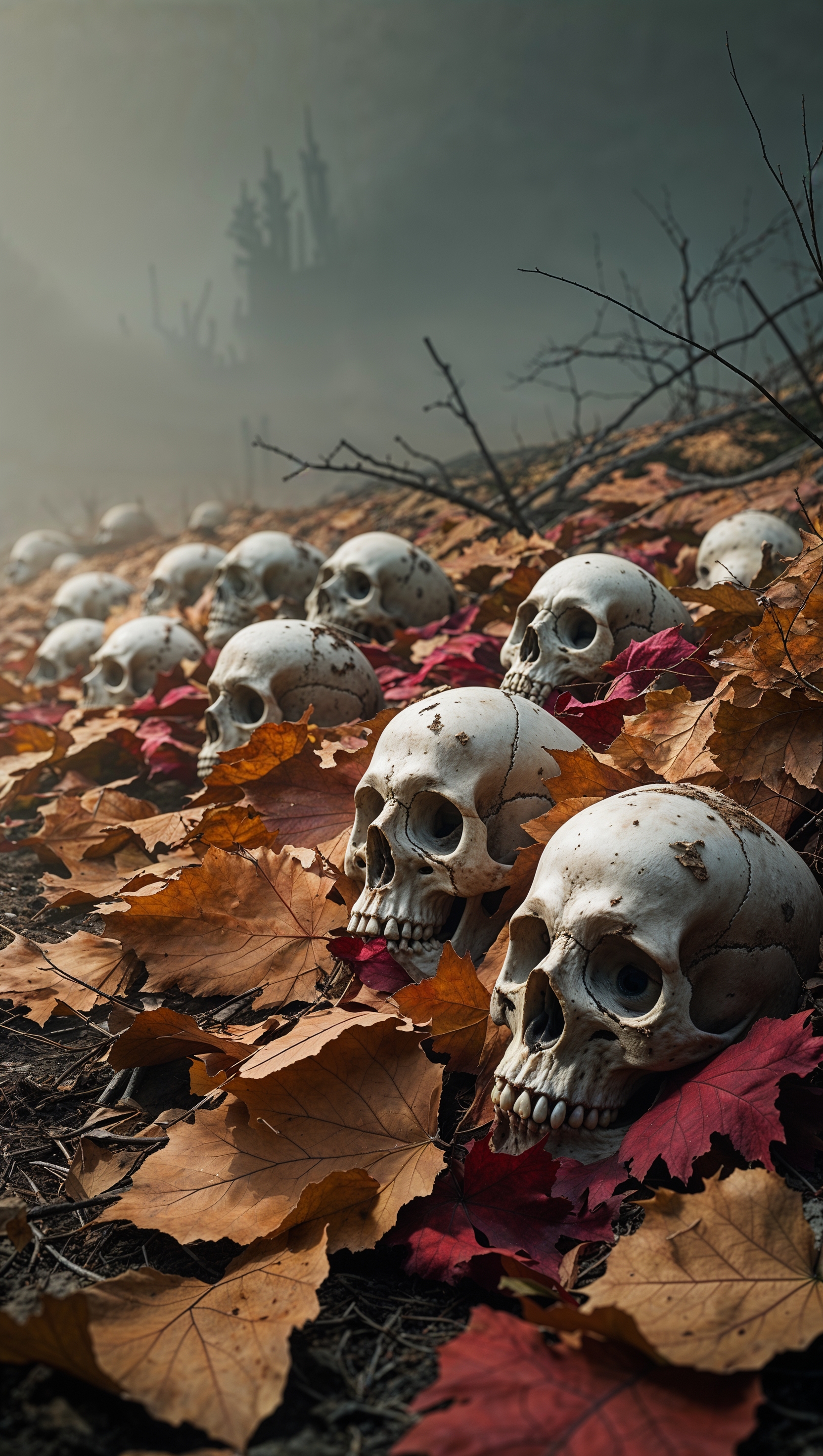 1664x2944 iPhone wallpaper with skulls on ground covered with dry leaves