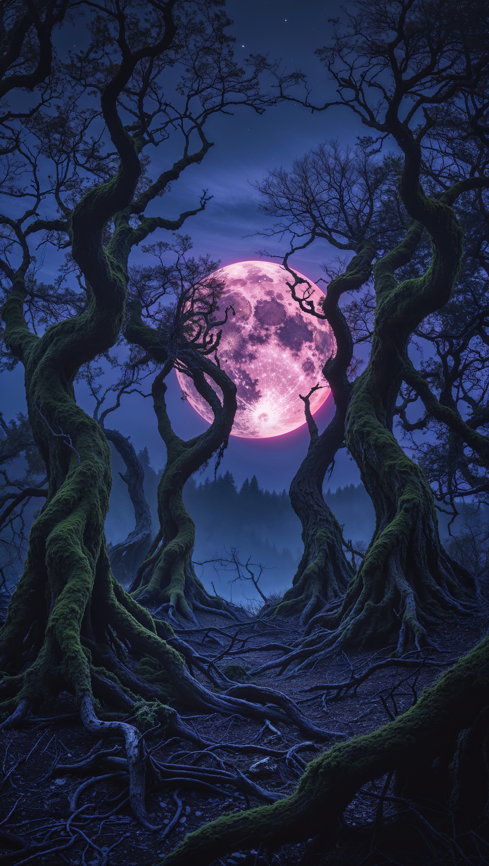 1664x2944 iPhone wallpaper with twisted trees and a blood moon