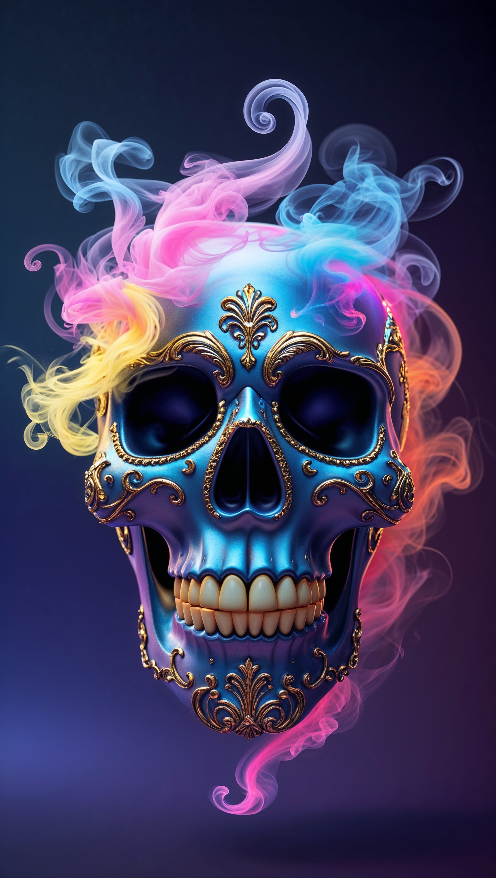 1664x2944 iPhone wallpaper with skull emitting colorful smoke