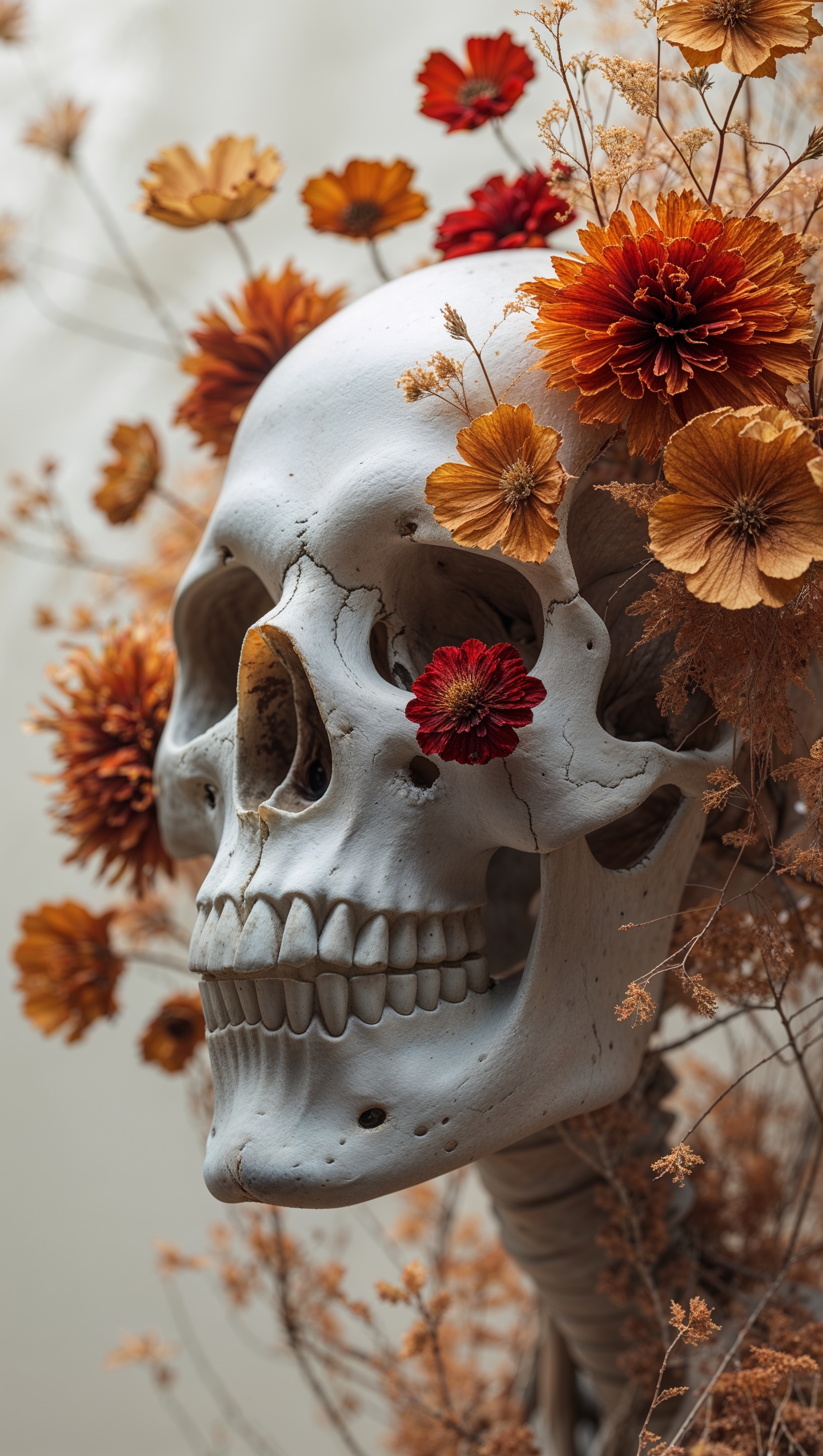 1664x2944 iPhone wallpaper with skull face and dried autumn flowers