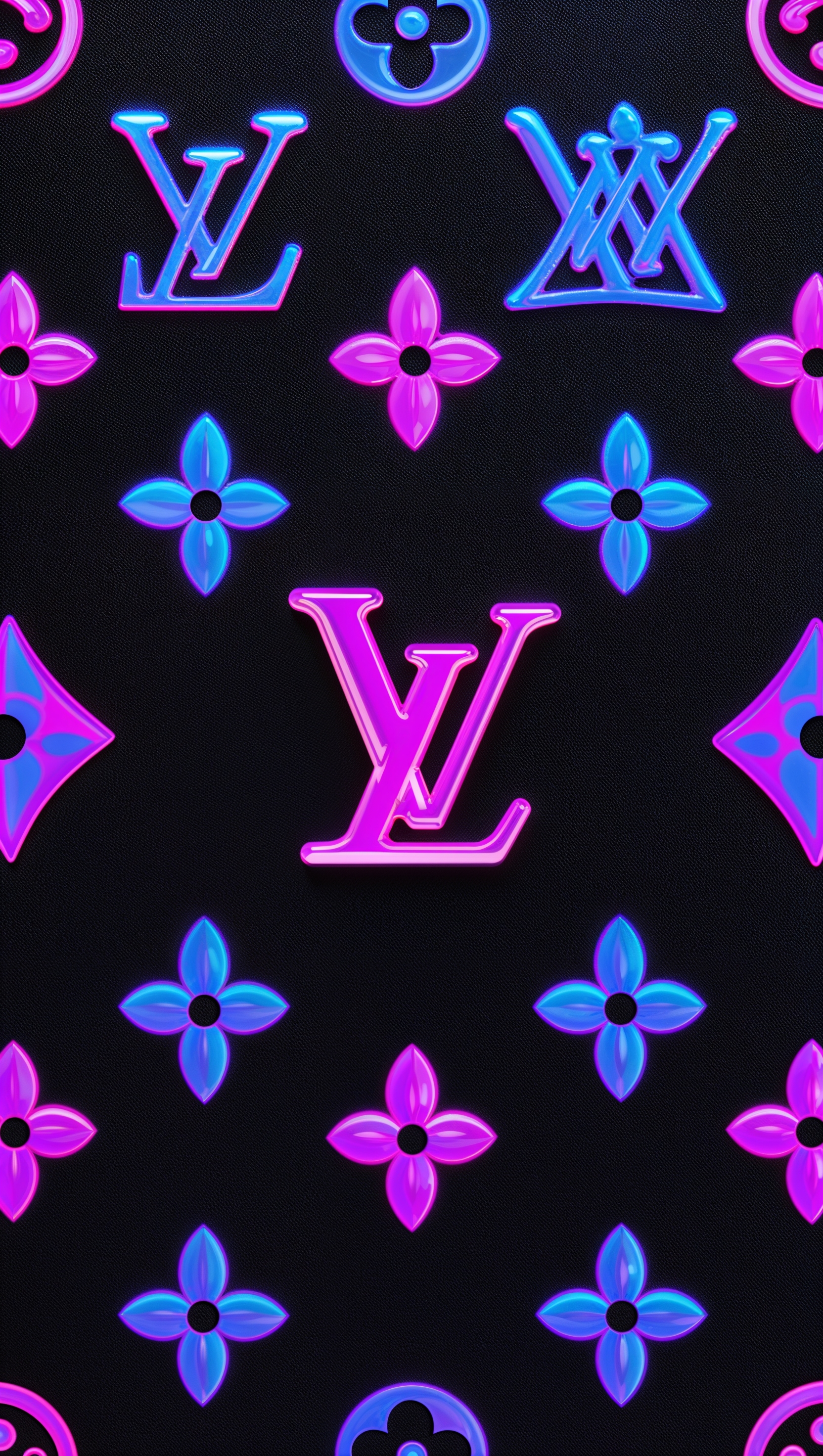 1664x2944 Black wallpaper with classic LV pattern and neon effect
